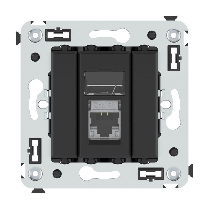 Компьютерная розетка RJ-45 в стену, одинарная. Категория: 6. Предназначена для монтажа в подрозеточные коробки глубиной не менее 45 мм (код 59301). Используется для подключения сетевого кабеля к рабочему месту. Характеристики: 8P8C; с пылезащитной шторкой; с маркировочной табличкой. Заделка не требует инструмента. 2 модуля. Цвет: Черный матовый.