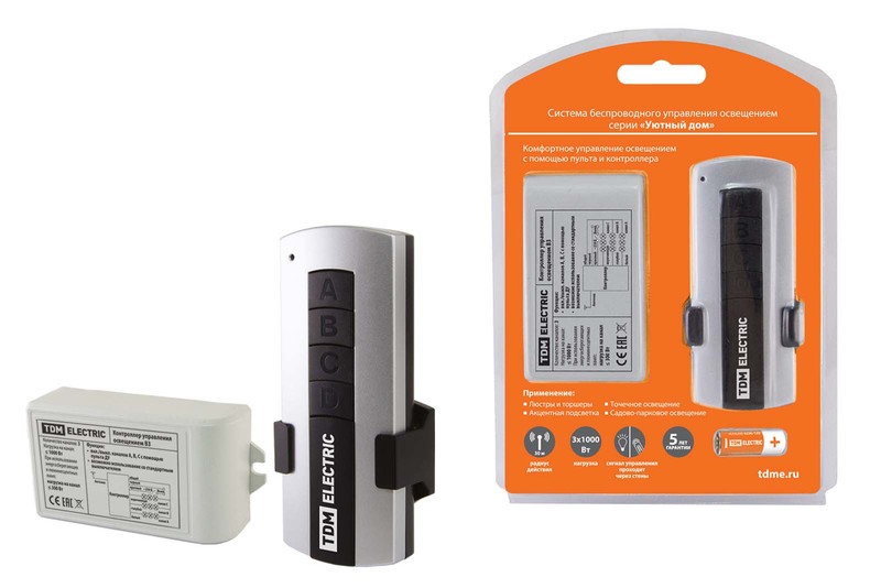 Применение:Дистанционное включение/отключение освещения:-люстры и торшеры;-акцентная подсветка;-точечное освещение;-садово-парковое освещение. Материалы:Пульты и контроллеры изготовлены из не поддерживающего горения пластика.Преимущества:Комфортное управление освещением.Полный базовый комплект для начала использования.Радиус действия до 30 метров.Удобное подключение и управление освещением, в том числе в люстрах.К контроллеру можно подключить до четырех каналов различных групп освещения (зависит от исполнения).Отсутствие необходимости прокладки дополнительных проводов, можно подключать к двухпроводной системе 2-4 канала нагрузки. Например : люстра+точечные светильники+светодиодная лента. Назначение:Для дистанционного беспроводного управления освещением. Конструкция:Пульт управления имеет в комплекте крепление на стену, фиксируемое к поверхности при помощи двухстороннего скотча (в комплекте) или при помощи саморезов.Передача сигнала осуществляется по радиочастоте 433,92 МГц.Управление осуществляется как при помощи пульта, так и с помощью стандартного настенного выключателя.