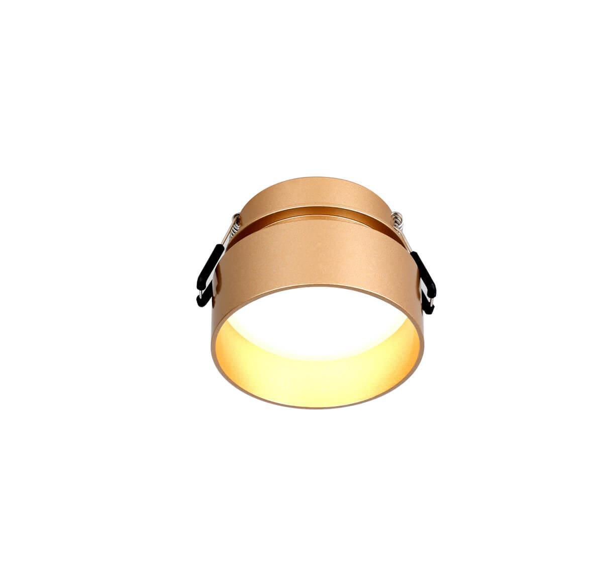 Врезной светильник золотого цвета, зазор между плафоном и поверхностью потолка оставляет оригинальный световой эффект, лампу можно менять