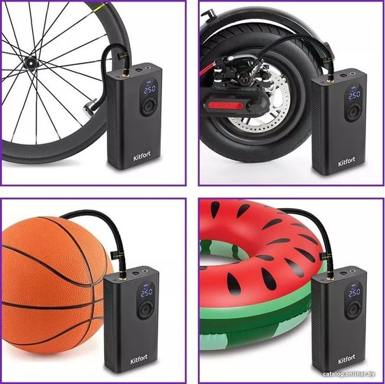 Комплект поставкиВ комплекте поставляются насадка для мяча, многофункциональные насадки с узким и широким соплом и переходник для клапана Преста. Шланг насоса съемный, что экономит место при хранении. Для удобного хранения КТ-2098 в комплекте есть чехол.