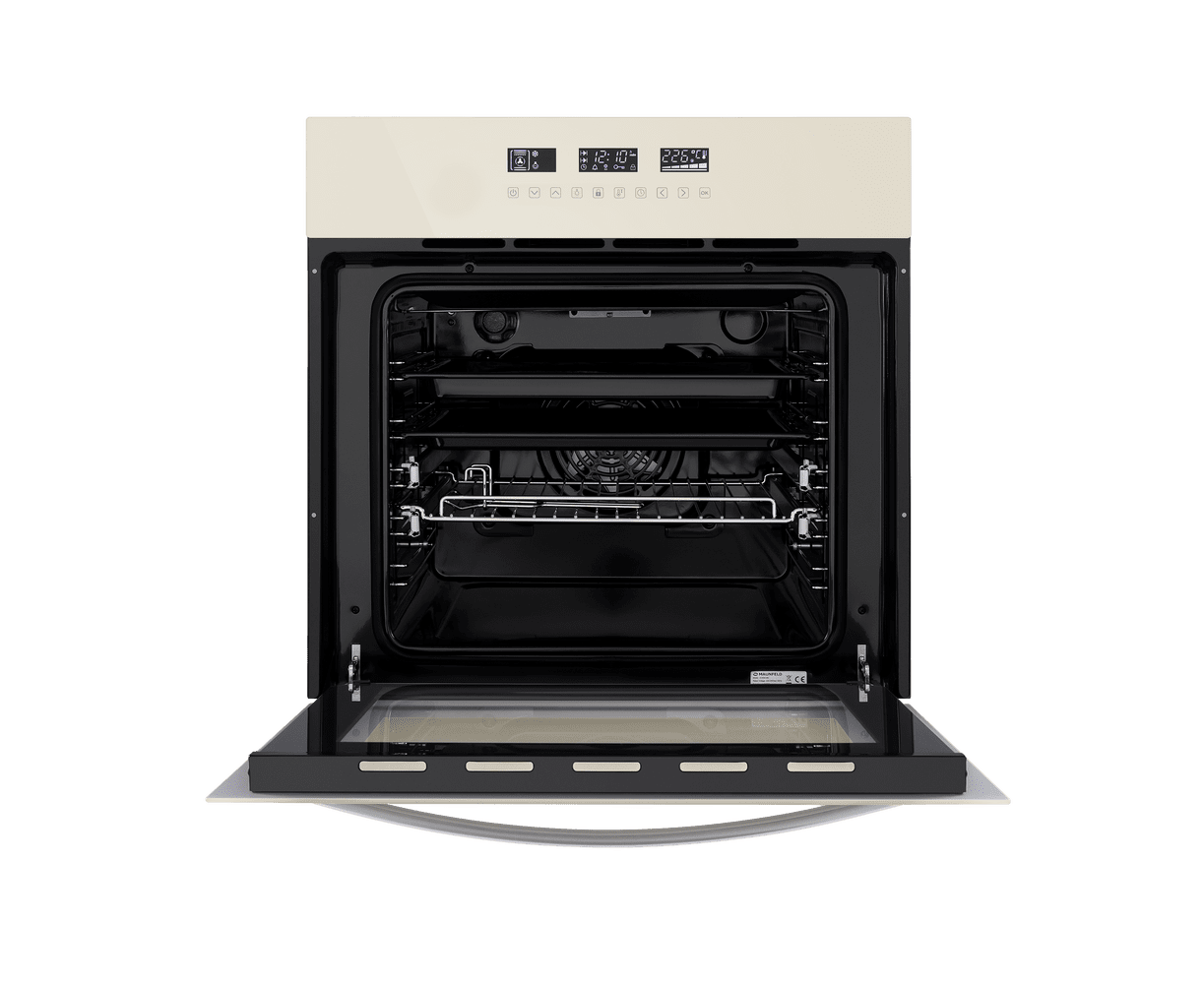 Фронтальная панель дверцы и лицевая часть блока управления сделаны из высококачественного жаропрочного стекла бежевого цвета. Цельнометаллическая ручка из полированной нержавеющей стали не нагревается в процессе готовки. Внутреннее покрытие камеры выполнено из специальной легкоочищающейся эмали черного цвета.