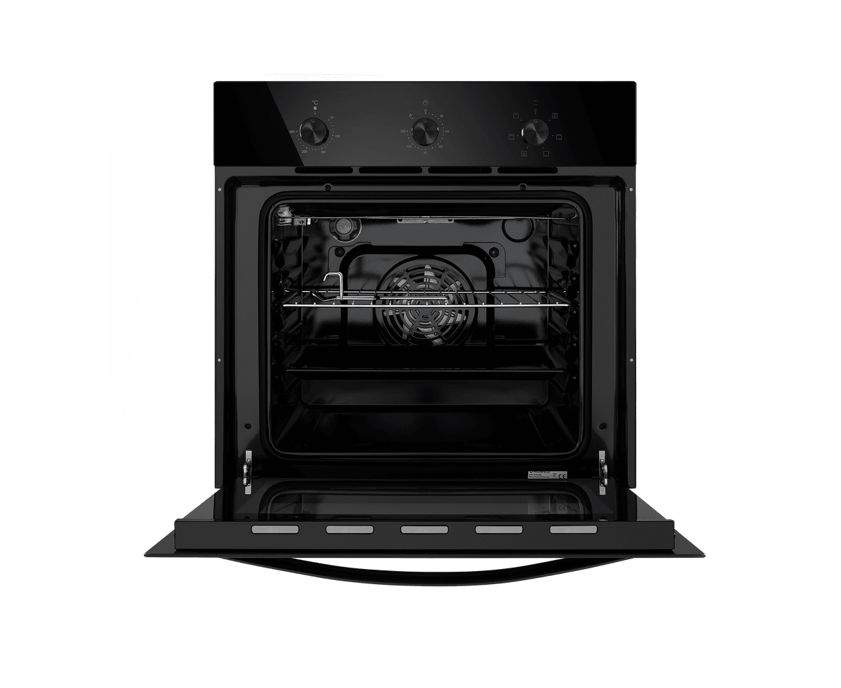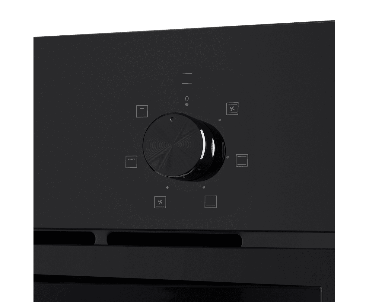 Механическое управление работой духовки осуществляется цельнометаллическими поворотными ручками черного цвета. Можно выбирать режим работы, температуру (50°-250°C) и устанавливать таймер (до 120 мин). В данной модели поддерживается 6 функций: внутреннее освещение, традиционный нагрев, гриль, нижний нагрев, конвекционный нагрев, пицца.