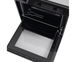 Фронтальная панель духовки сделана из высококачественного жаропрочного тонированного стекла черного цвета. Цельнометаллическая ручка дверцы черного цвета остается холодной в процессе готовки. Внутреннее покрытие камеры выполнено из специальной легкоочищающейся эмали черного цвета.