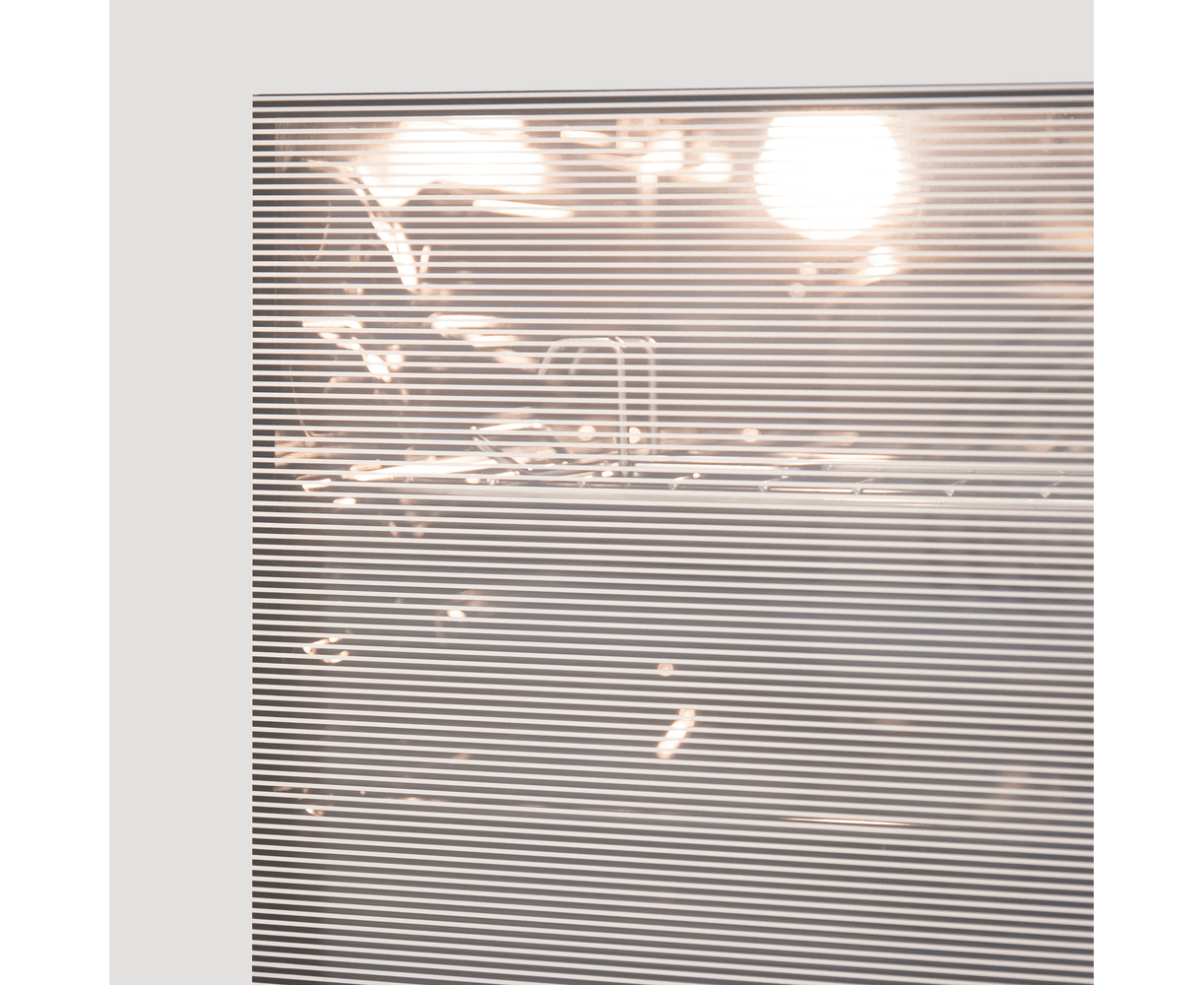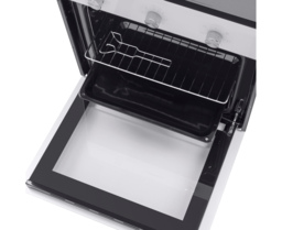 Фронтальная панель духовки сделана из высококачественного жаропрочного тонированного стекла белого цвета. Цельнометаллическая ручка дверцы остается холодной в процессе готовки. Внутреннее покрытие камеры выполнено из специальной легкоочищающейся эмали черного цвета.