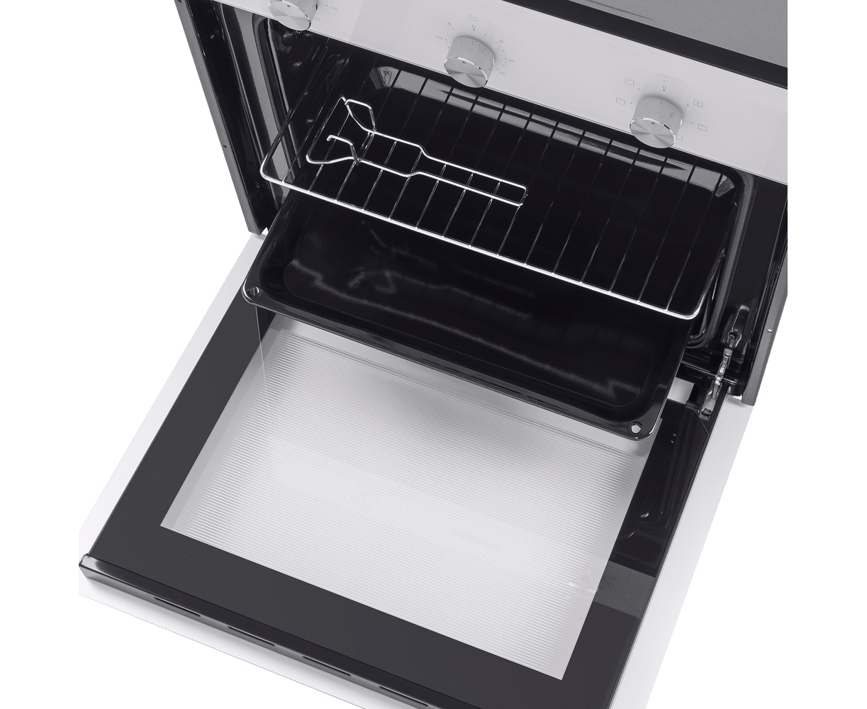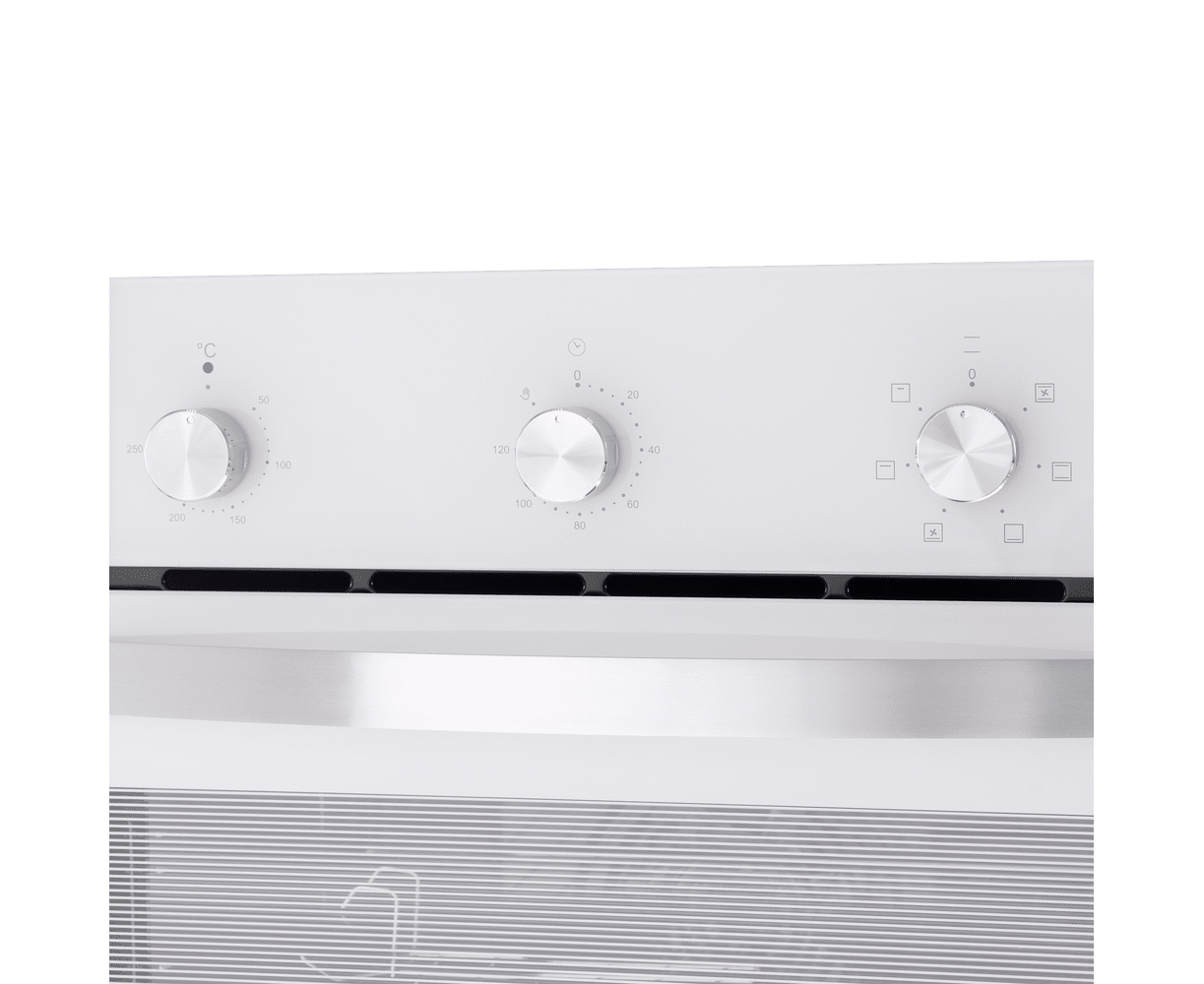 Механическое управление работой духовки осуществляется цельнометаллическими поворотными ручками. Можно выбирать режим работы, температуру (50°-250°C) и устанавливать таймер (до 120 мин). В данной модели поддерживается 6 функций: внутреннее освещение, традиционный нагрев, гриль, нижний нагрев, конвекционный нагрев, пицца.