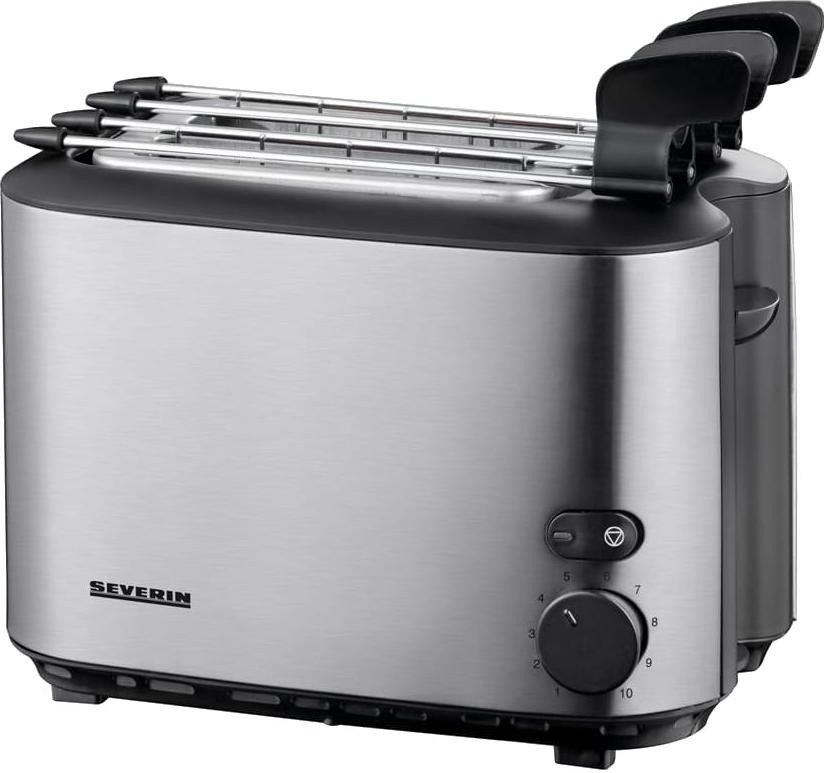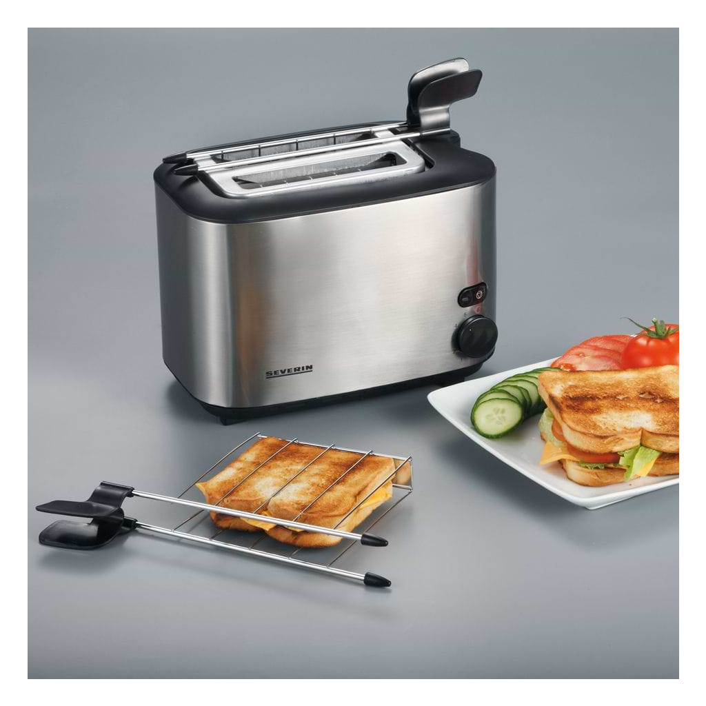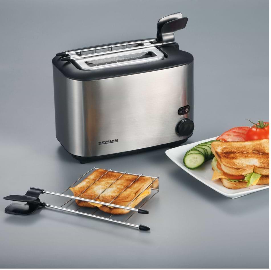 Автоматичний тостер Severin AT 2516 зі щипцями для сендвічів. Візьміть два шматочки хліба, з начинкою всередині, затисніть їх щипцями та помістіть у відділення для тостів.