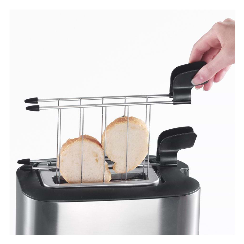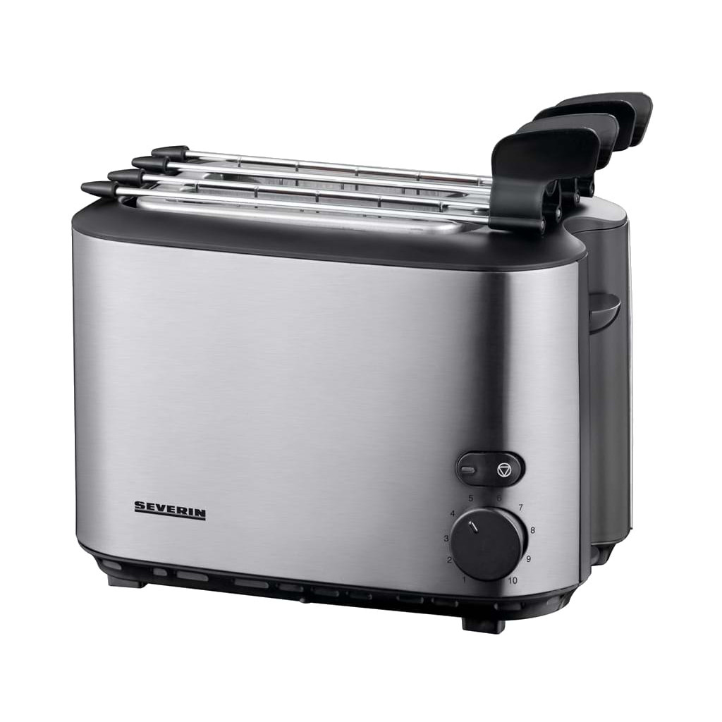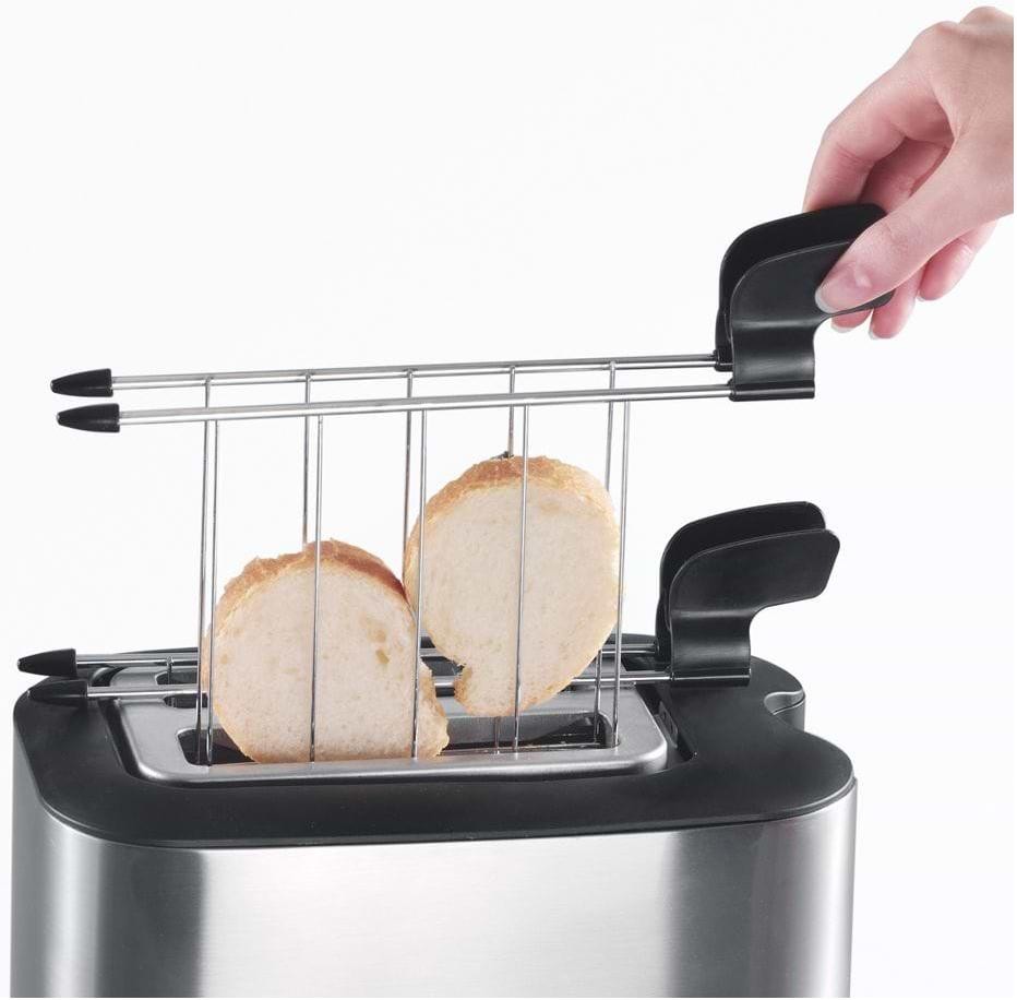 У комплекті двоє щипців для хліба. Тостер вмикається за допомогою важеля, засвічується індикаторна лампочка. Тостер вимикається автоматично.