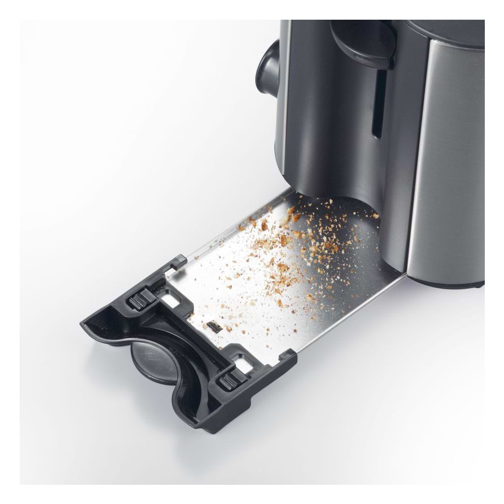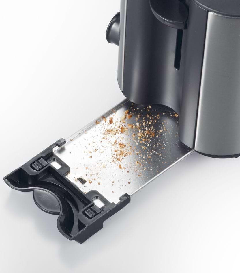 Високоякісний теплоізольований корпус із неіржавкої сталі з подвійними стінками. З піддоном для крихт легко очистити тостер від забруднень.