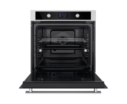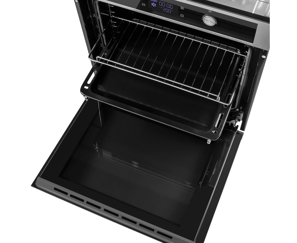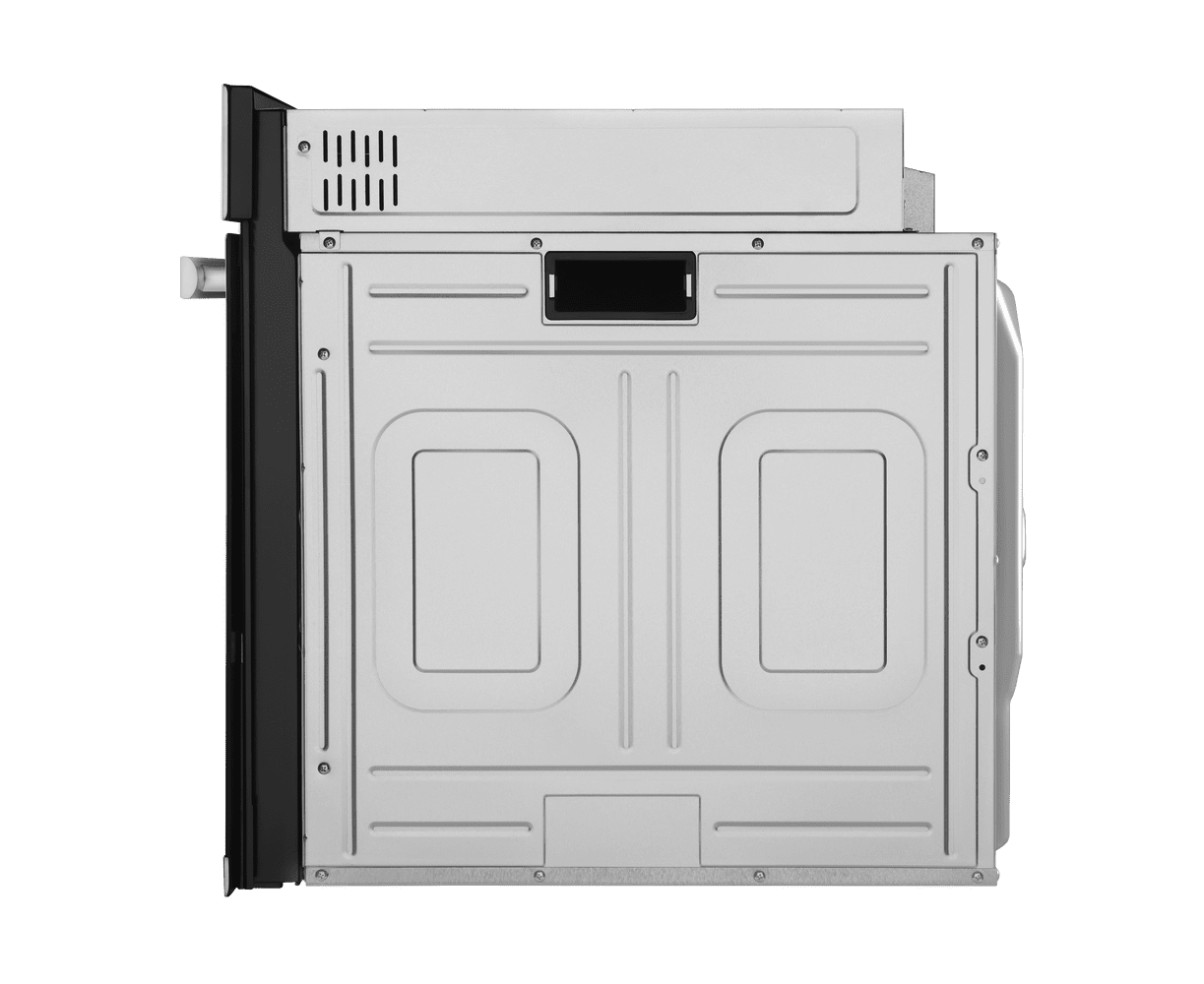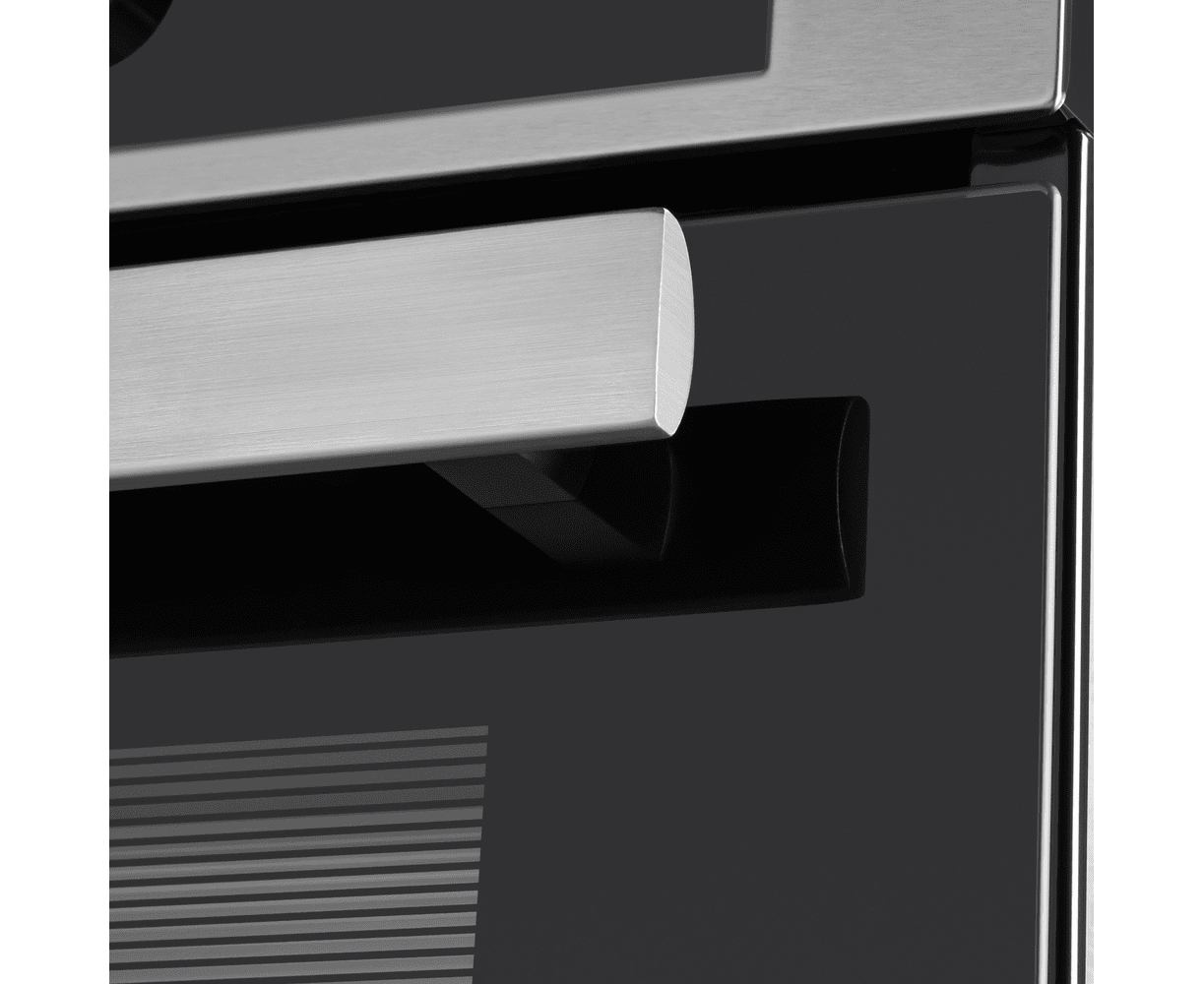 Фронтальная панель духовки выполнена из высококачественного жаропрочного тонированного стекла черного цвета. Ручка дверцы и ручки управления, сделанные из матированной нержавеющей стали черного цвета, не нагреваются в процессе готовки.
