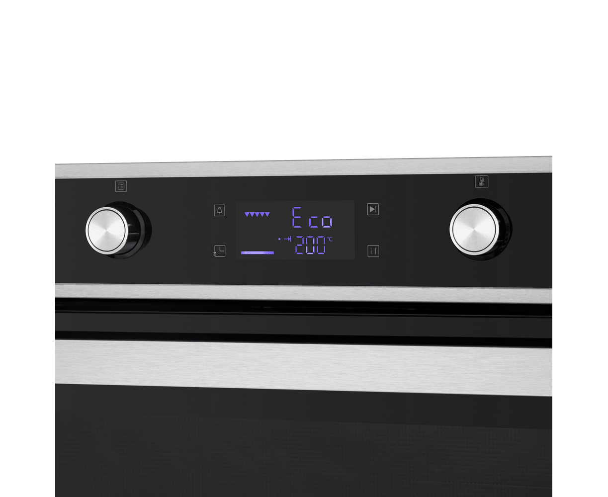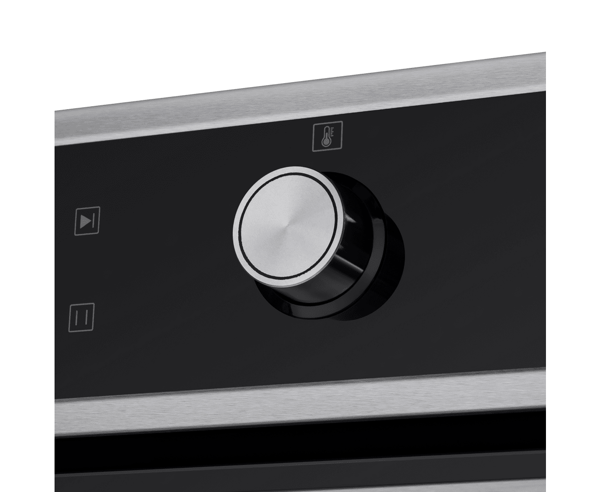 Комбинированное управление реализовано в виде сенсорного дисплея с подсветкой для сенсорного управления и поворотных ручек PUSH PULL, которые легким нажатием убираются внутрь корпуса. Можно выбрать режим работы, температуру (50°-250°C), установить таймер и блокировку от детей. В данной модели есть 9 режимов работы: традиционный нагрев, конвекционный нагрев, полный гриль, ЕСО, нижний нагрев, половинный гриль, разморозка, конвекция с грилем, освещение.