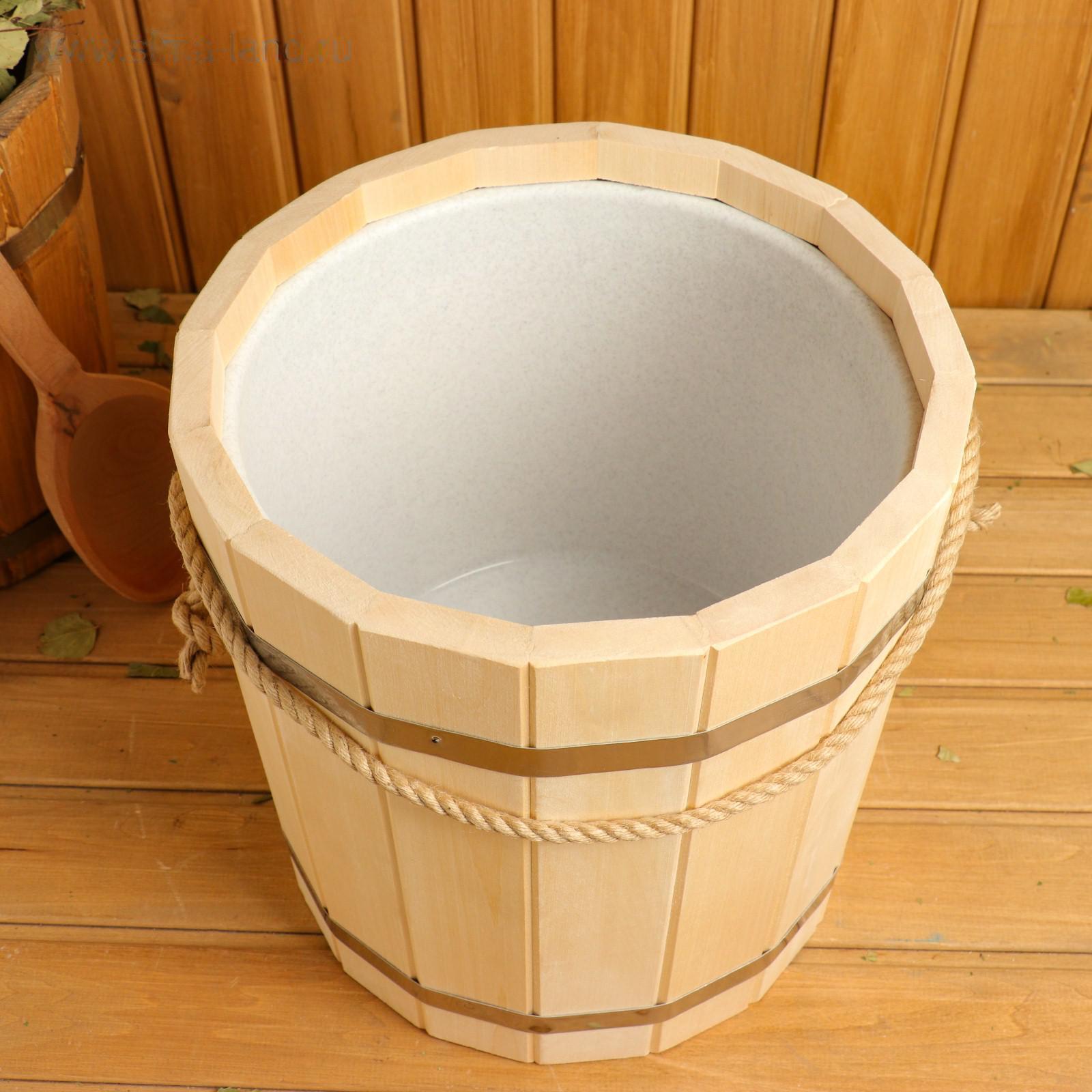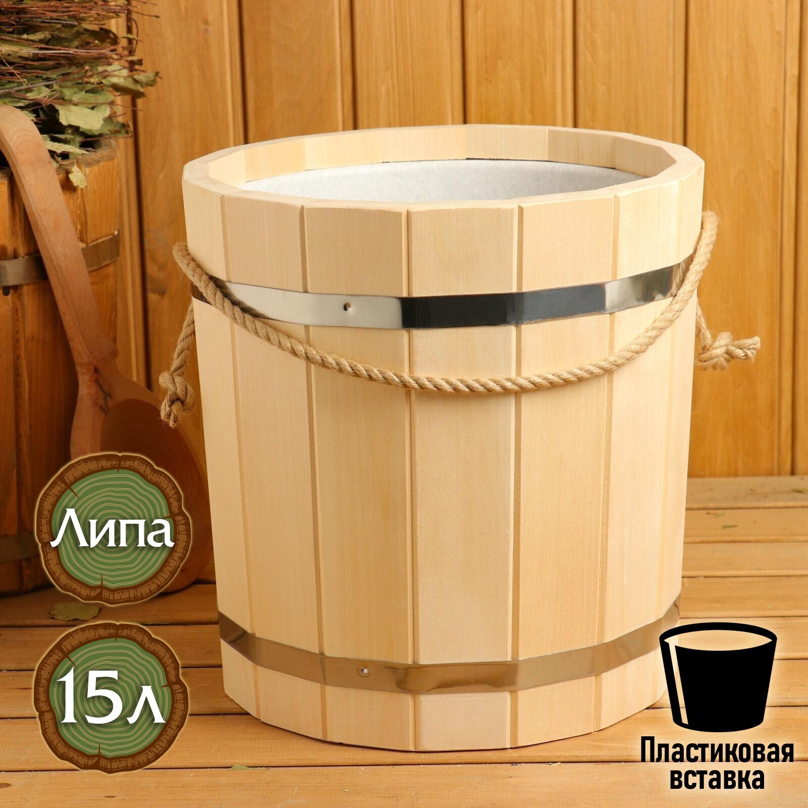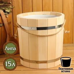 Ведро из липы, 15л, пластиковая вставка, ручка-веревка
