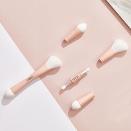 4 инструмента для макияжа в 1 компактном варианте: кисть для теней, кисть для бровей, кисть для лица и спонж.