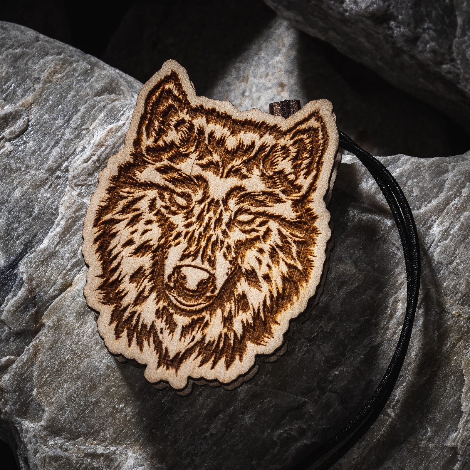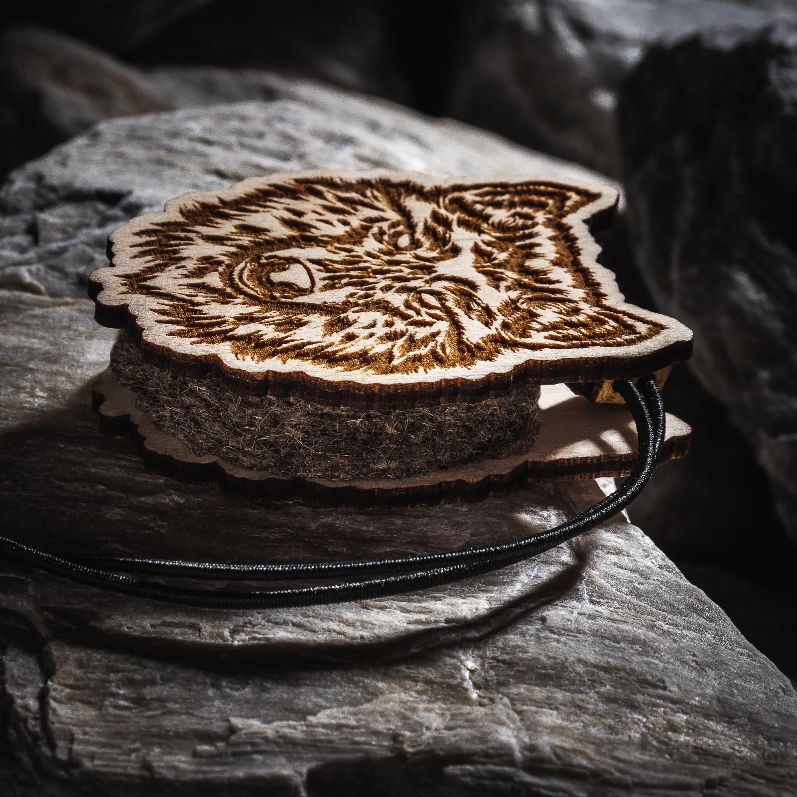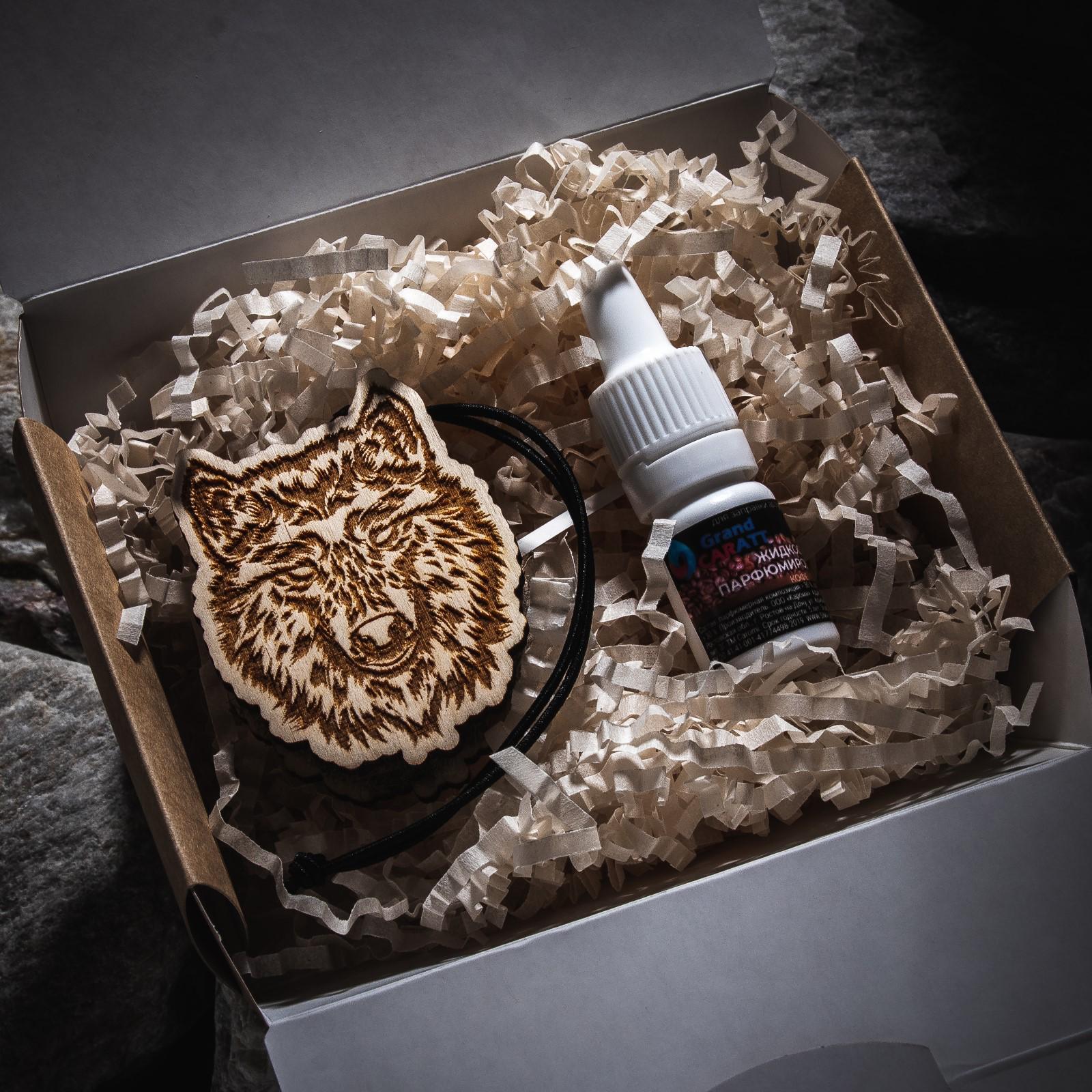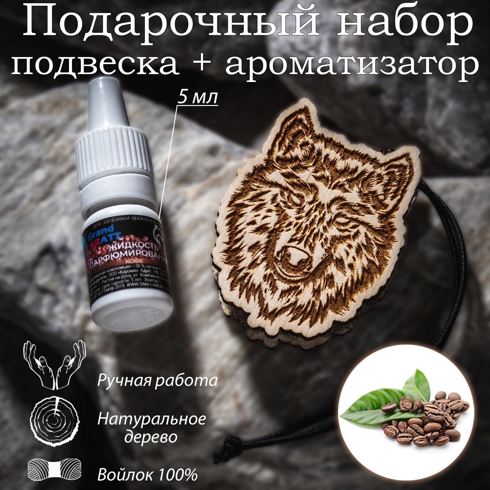 Ароматизатор подвесной из натурального дерева, набор: подвеска Волк (дерево, войлок), парфюмированная пропитка Кофе, 5 мл