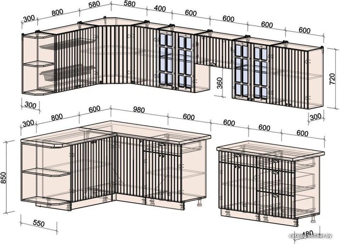 - Высота нижних шкафов 55 см