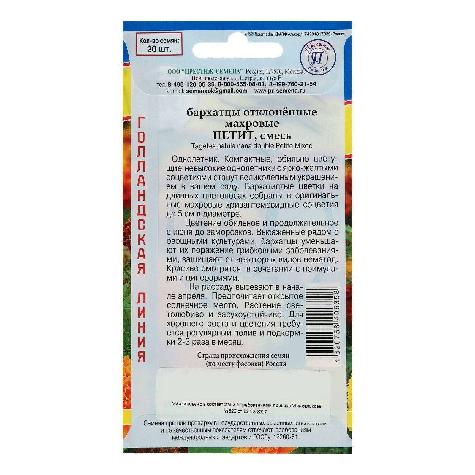 Семена цветов Бархатцы отклонённые "Петит" смесь, О, 20 шт