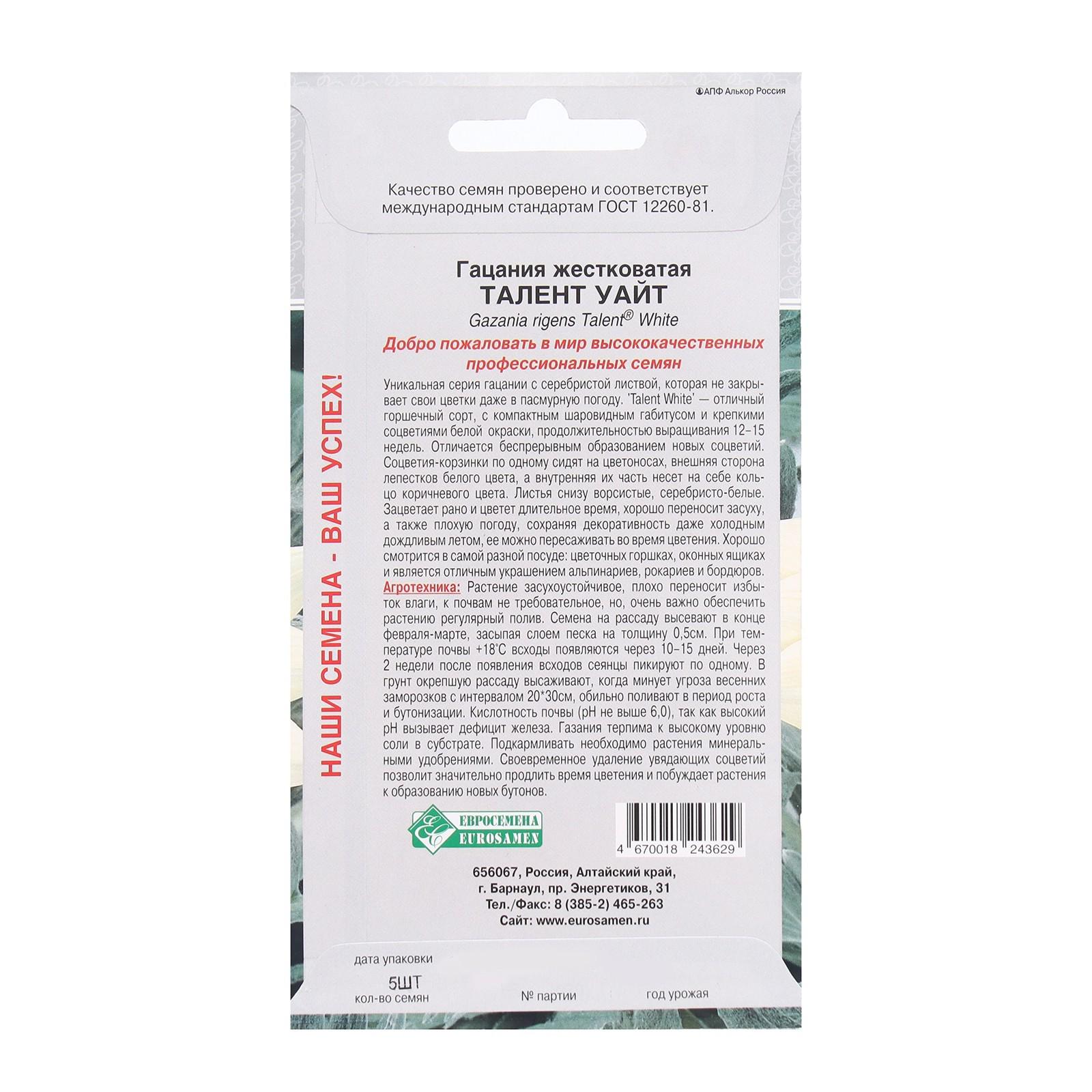Уникальная серия гацании с серебристой листвой, которая не закрывает свои цветки даже в пасмурную погоду.Talent White -отличный горшечный сорт, с компактным шаровидным габитусом и крепкими соцветиями белой окраски, продолжительностью выращивания 12-15 недель.Отличается беспрерывным образованием новых соцветий.Соцветия-корзинки по одному сидят на цветоносах, внешняя сторона лепестков белого цвета, а внутренняя их часть несет на себе кольцо коричневого цвета.Листья снизу ворсистые, серебристо-белые.Зацветает рано и цветет длительное время, хорошо переносит засуху, а также плохую погоду, сохраняя декоративность даже холодным дождливым летом, ее можно пересаживать во время цветения.Хорошо смотрится в самой разной посуде: цветочных горшках, оконных ящиках и является отличным украшением альпинариев, рокариев и бордюров.Высота растения-15 см.Диаметр цветка-8 см.Растение засухоустойчивое, плохо переносит избыток влаги, к почвам не требовательное, но, очень важно обеспечить растению регулярный полив.Семена на рассаду высевают в конце февраля- марте, засыпая слоем песка на толщину 0,5 см.При температуре почвы +18 °С всходы появляются через 10-15 дней.Через 2 недели после появления всходов сеянцы пикируют по одному.В грунт окрепшую рассаду высаживают, когда минует угроза весенних заморозков с интервалом 20*30 см, обильно поливают в период роста и бутонизации.