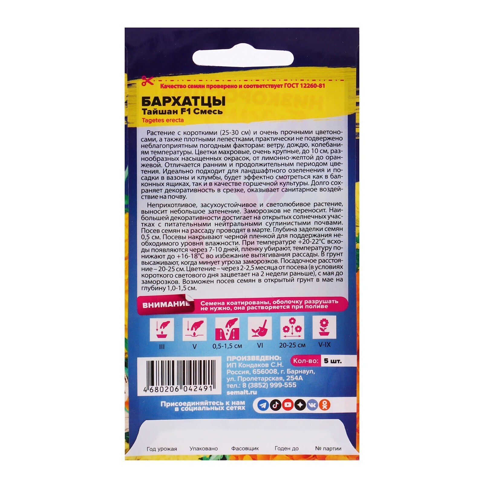 Семена цветов Бархатцы "Тайшан", смесь, Сем. Алт, ц/п, 5 шт