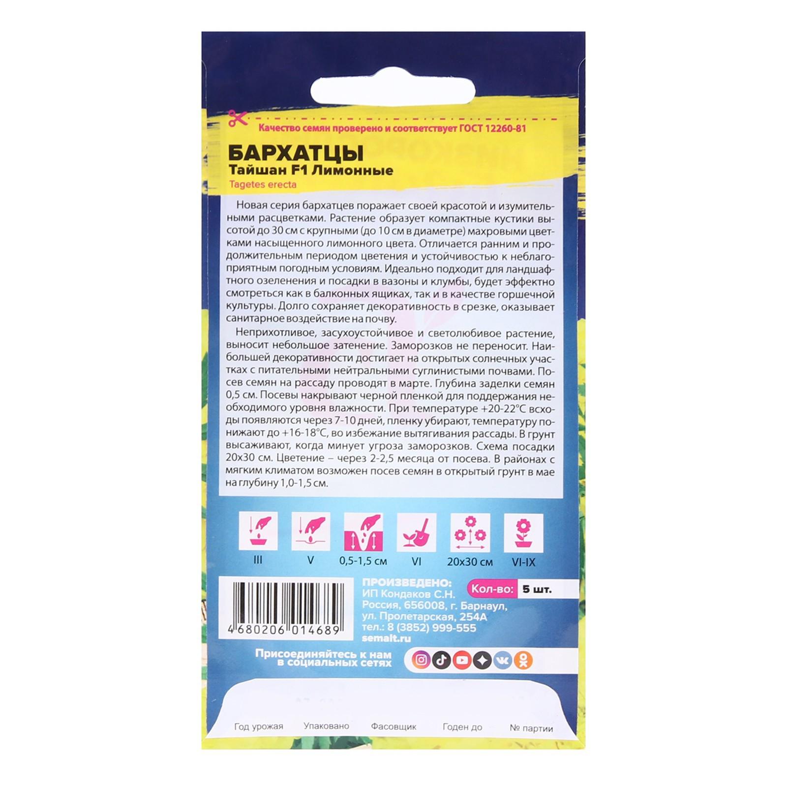 Семена цветов Бархатцы "Тайшан", лимонные, Сем. Алт, ц/п, 5 шт