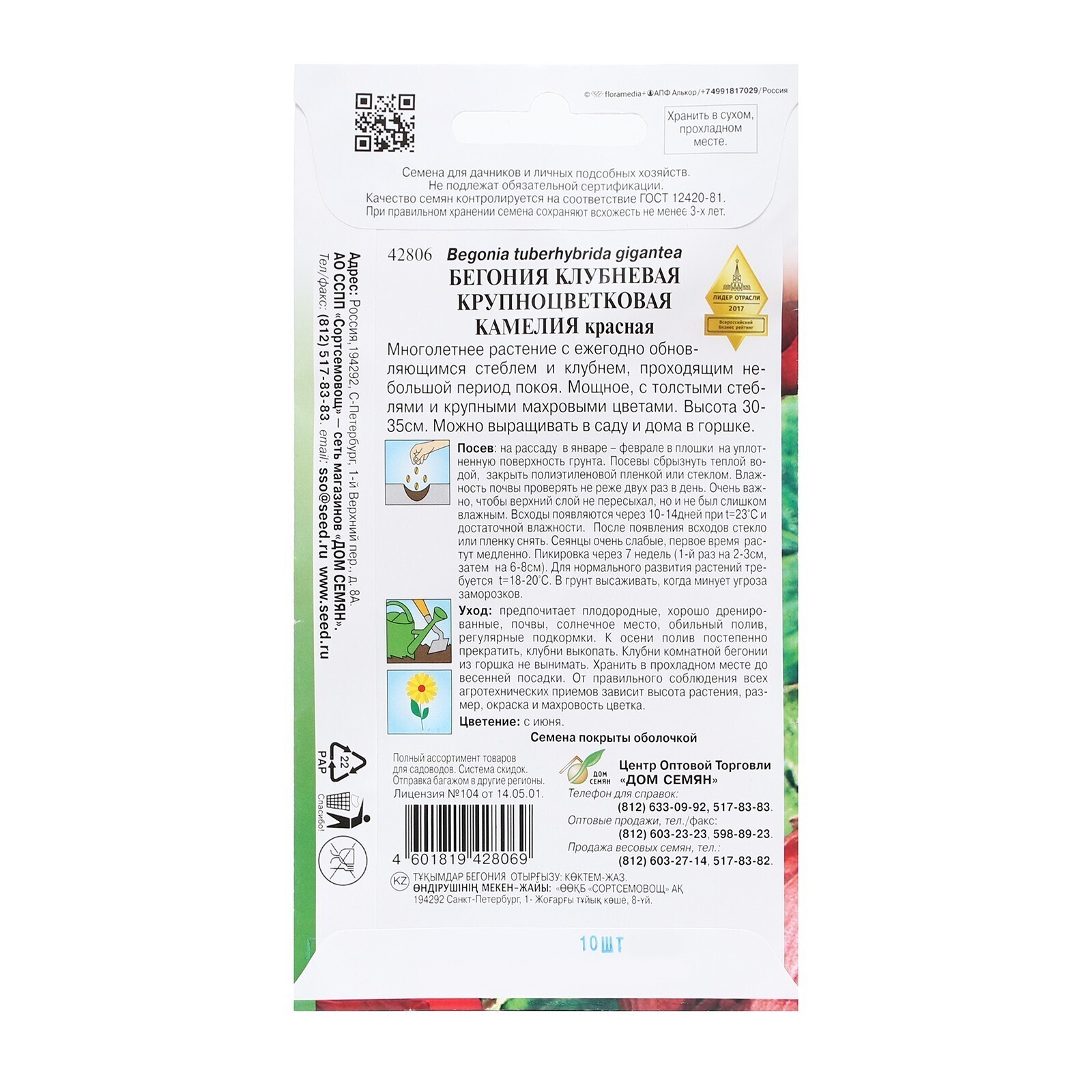 Семена цветов Бегония крупноцвет "Камелия", красная, 10 шт