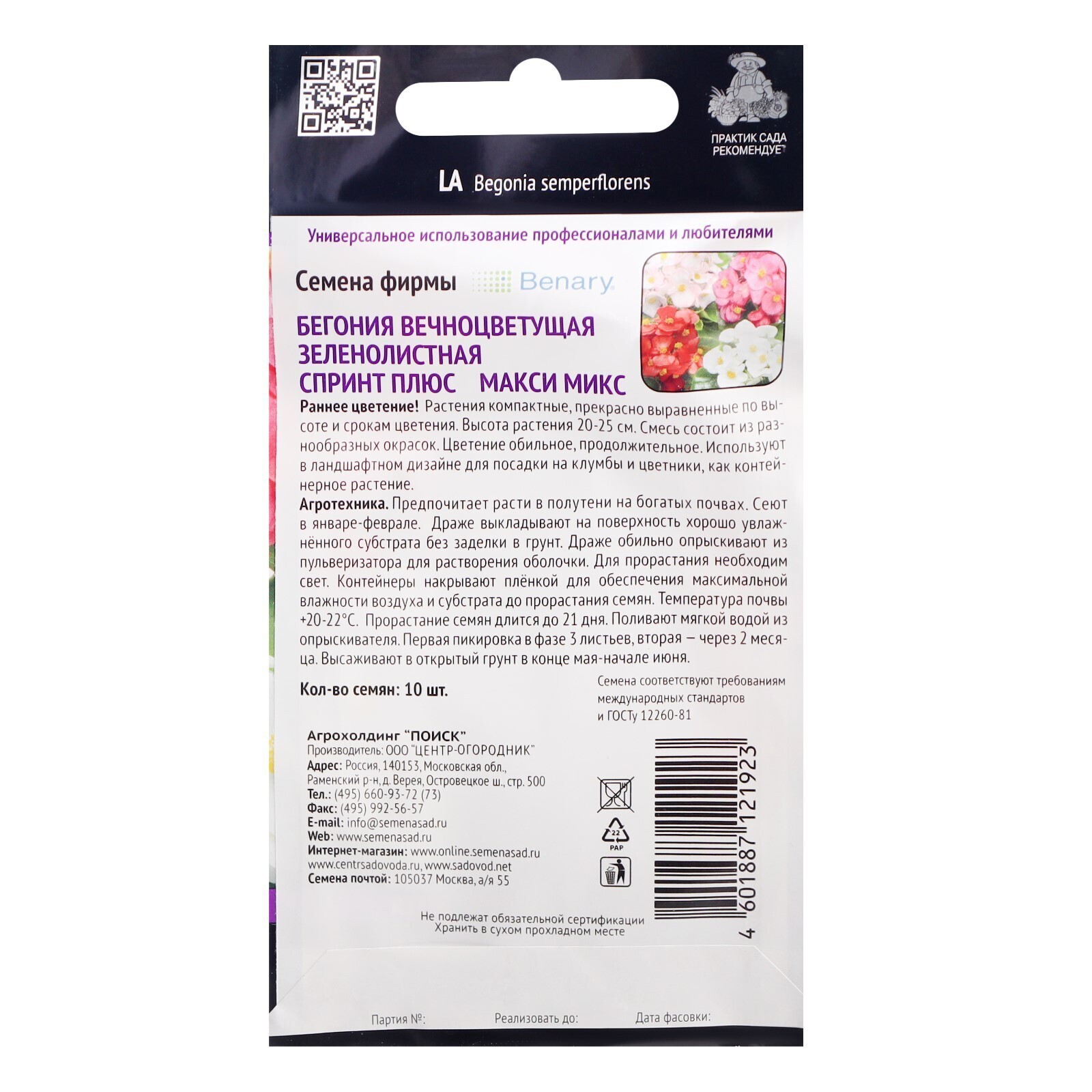 Семена цветов Бегония вечноцветущая зеленолистная "Спринт Плюс Макси", Микс, 10 шт.
