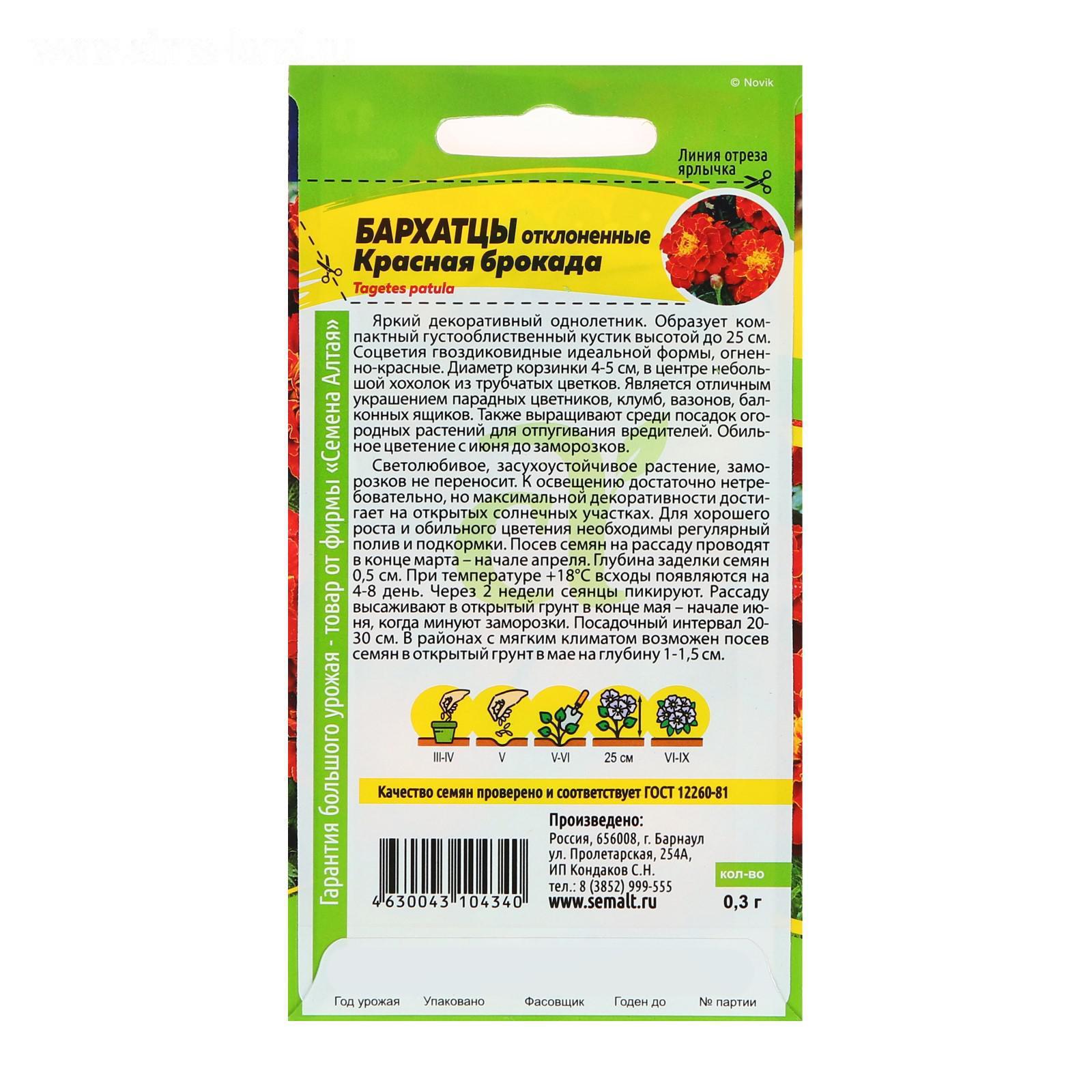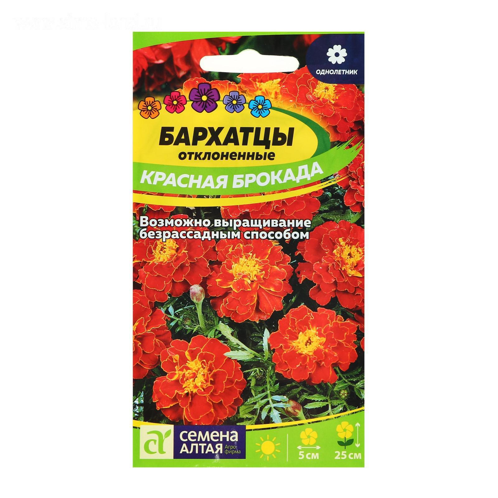 Семена цветов Бархатцы "Красная Брокада" подойдут для любого сада. Яркие растения не требуют сложного ухода и легко приживаются на самой неплодородной земле. Они эффектно выделяются на фоне газона или фруктового сада, но активно цветут и на балконе. Бутон насыщенного оттенка выгодно сочетается с другими растениями и подходит для любого букета. Компактные кустики обильно покрыты махровыми, насыщенной окраски соцветиями. Используются для оформления различных клумб, рабаток, бордюров, балконов. 25 см.