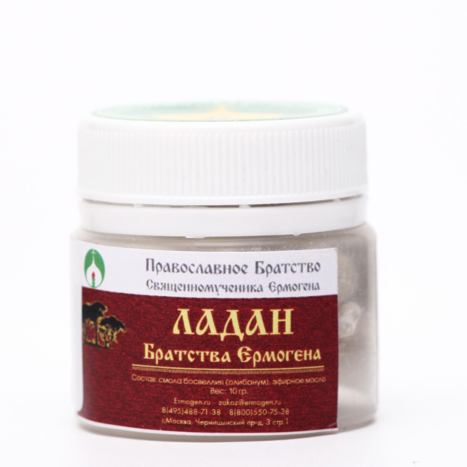 Ладан производства братства священномученика Ермогена изготавливается из натуральной смолы, выделяющейся из деревьев рода Босвеллия, что произрастают на Аравийском полуострове и в Восточной Африке, с добавлением эфирного масла и специальной обсыпки в виде пищевого мела.