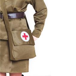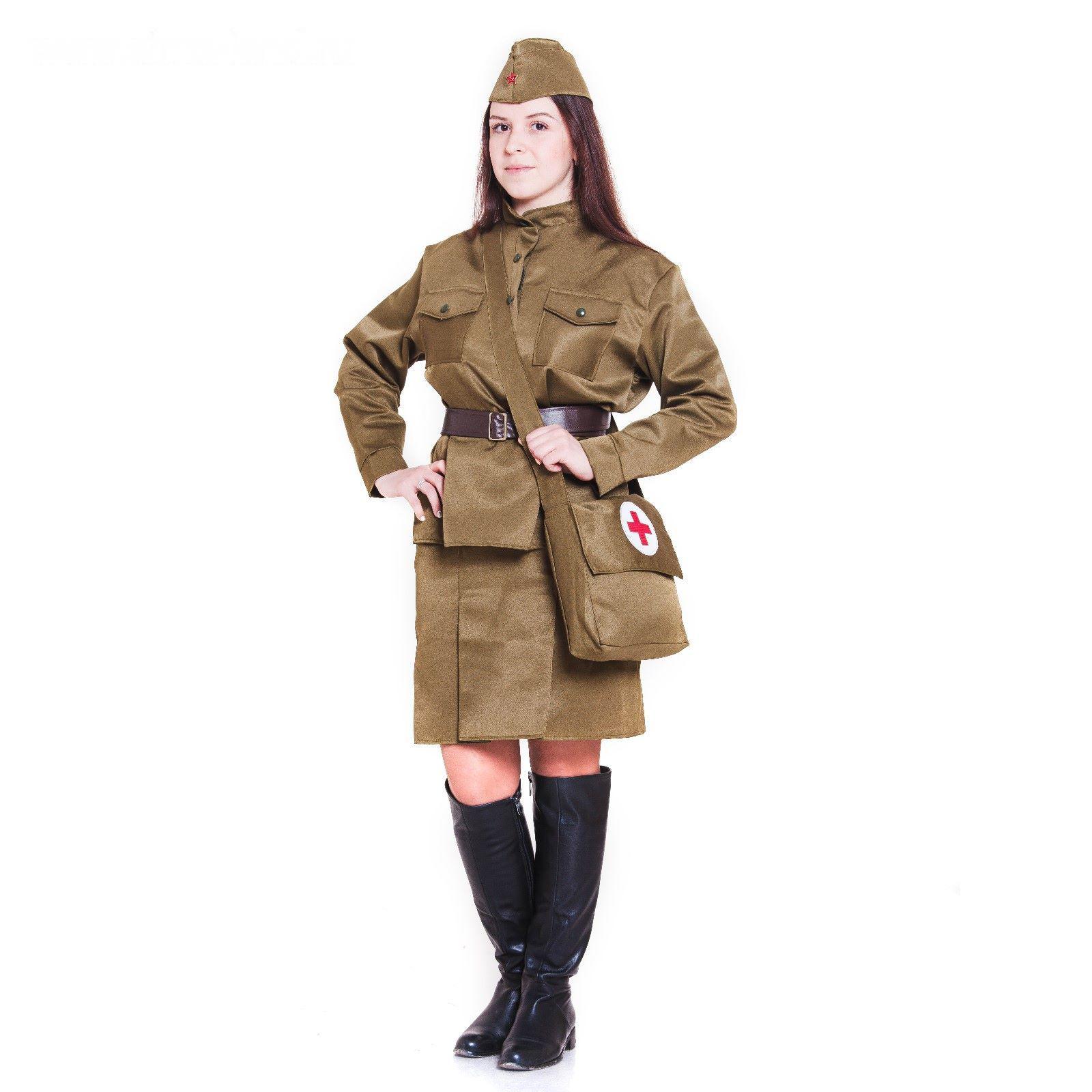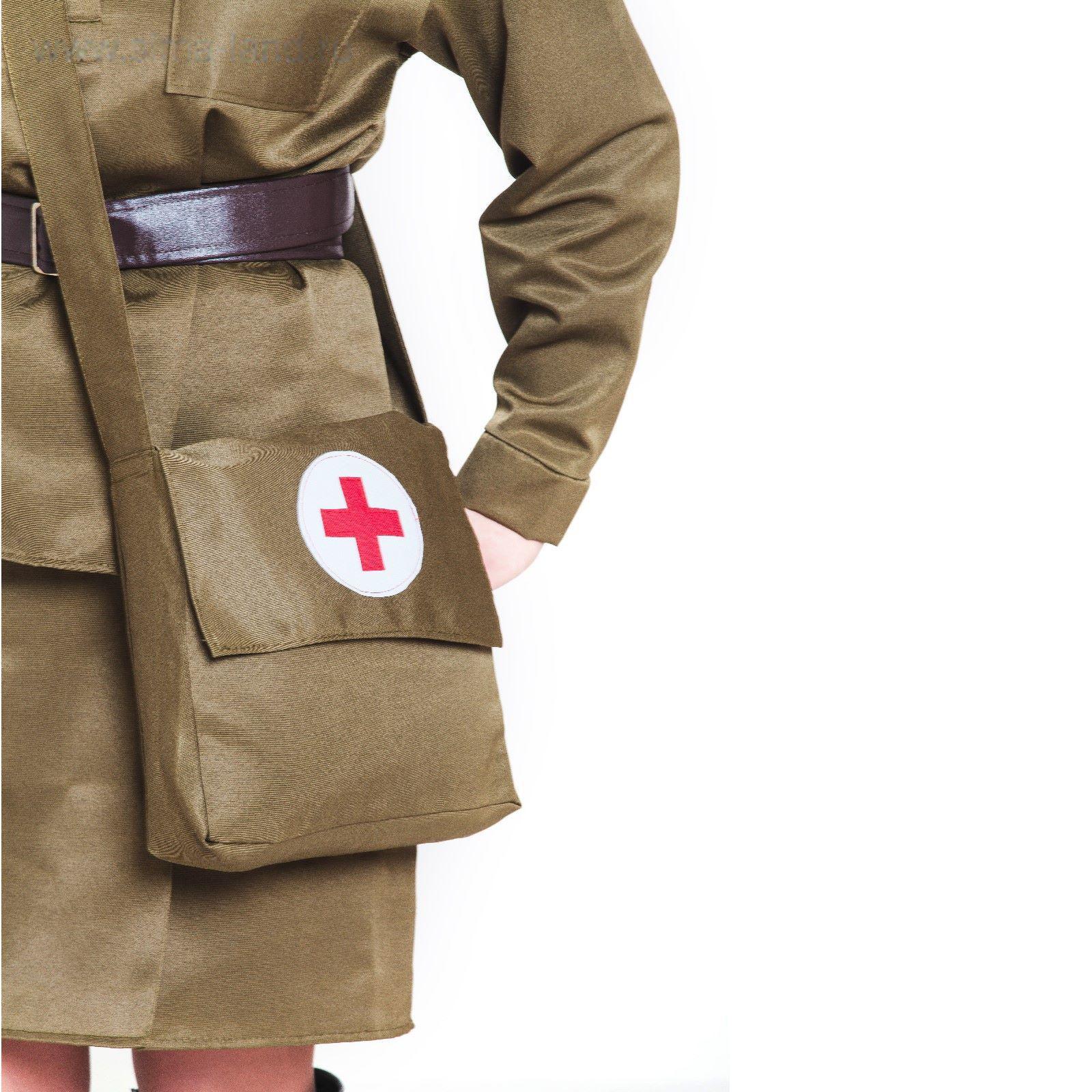 Стилизованная юбка не сковывает движений — в ней вы без труда исполните военный танец и останетесь женственной даже на «поле боя»! Дополняет комплект складная пилотка старого образца и медицинская сумка наперевес.
