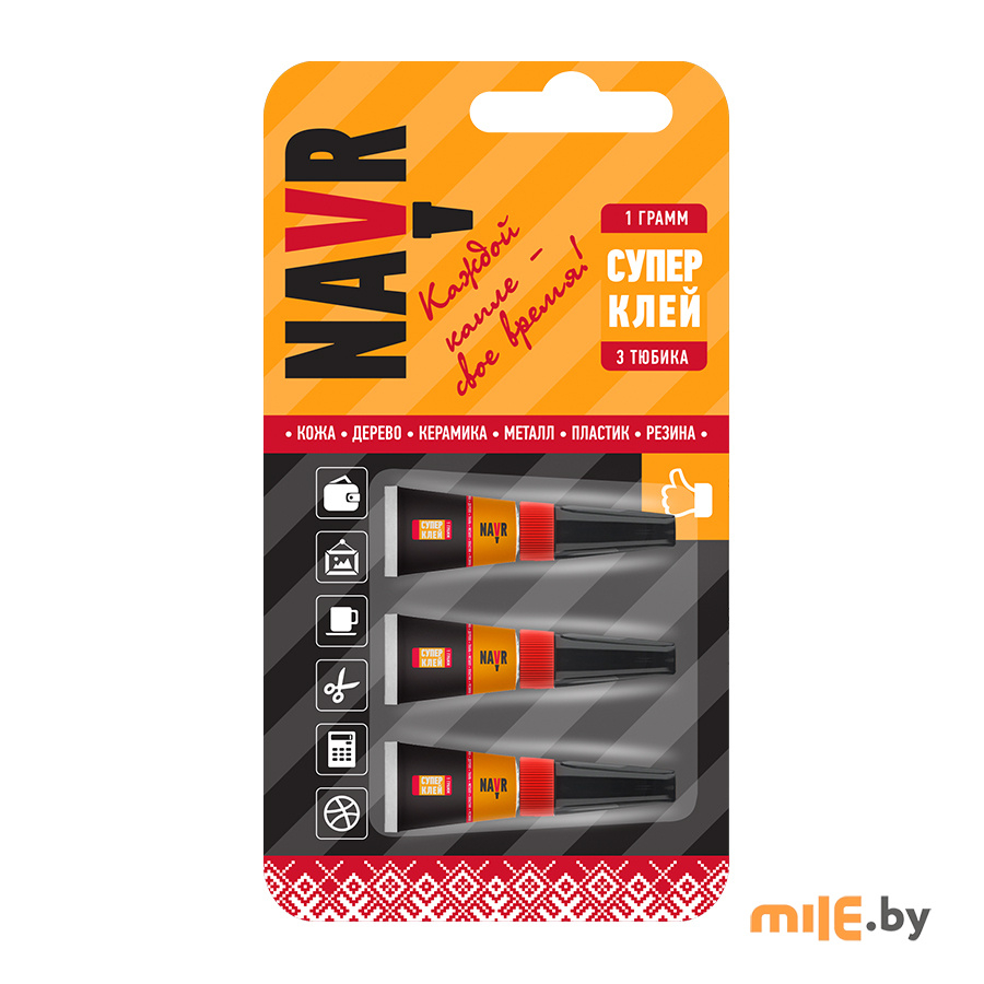 Cупер клей Navr 3 в 1 обеспечивает экономный расход при доступной стоимости. Клеевой шов, создаваемый этим клеем, устойчив к влаге и органическим растворителям. Этот клей универсален, им можно склеить как керамику, металл и пластик, так и резину, дерево и кожу. Это надежный и быстрый секундный клей.