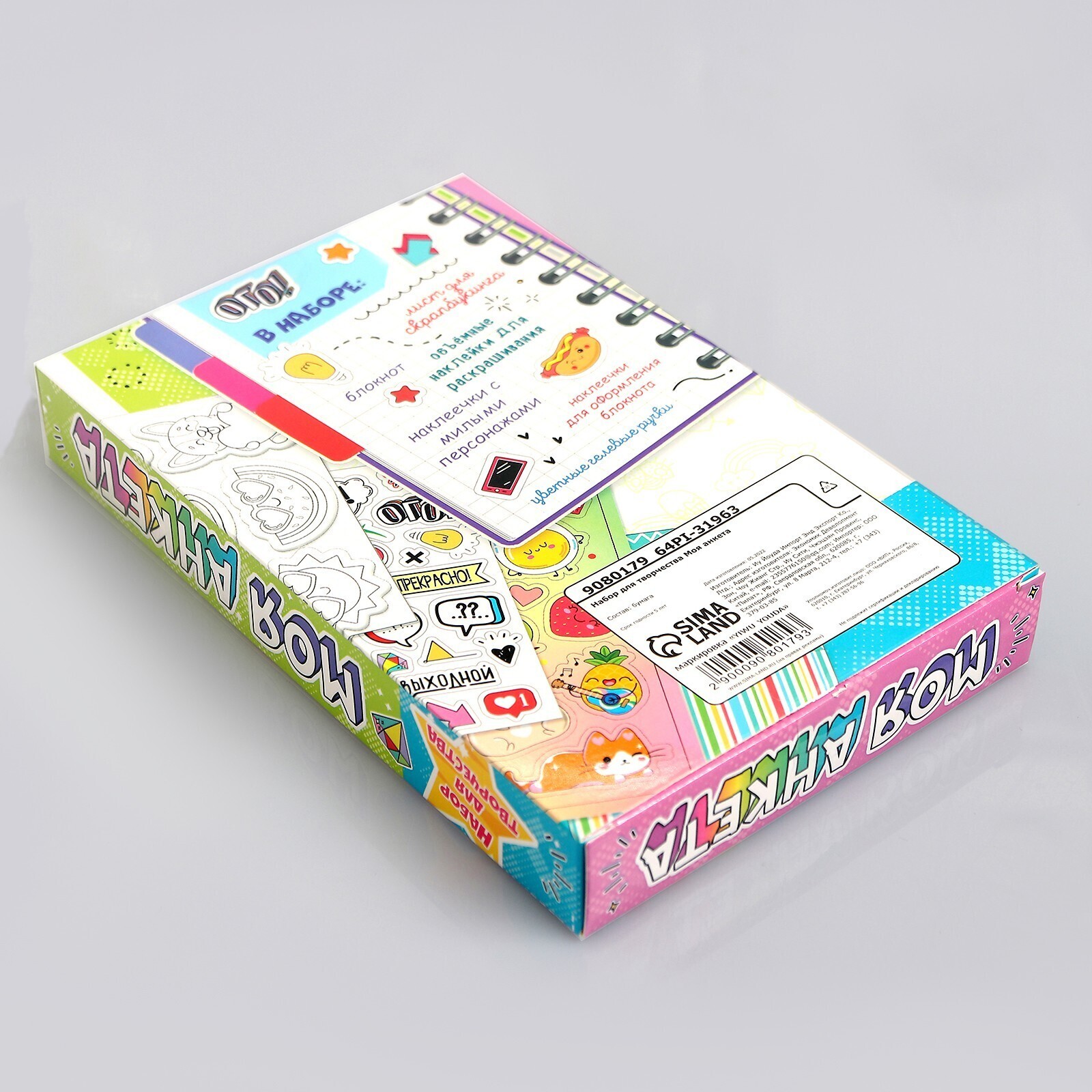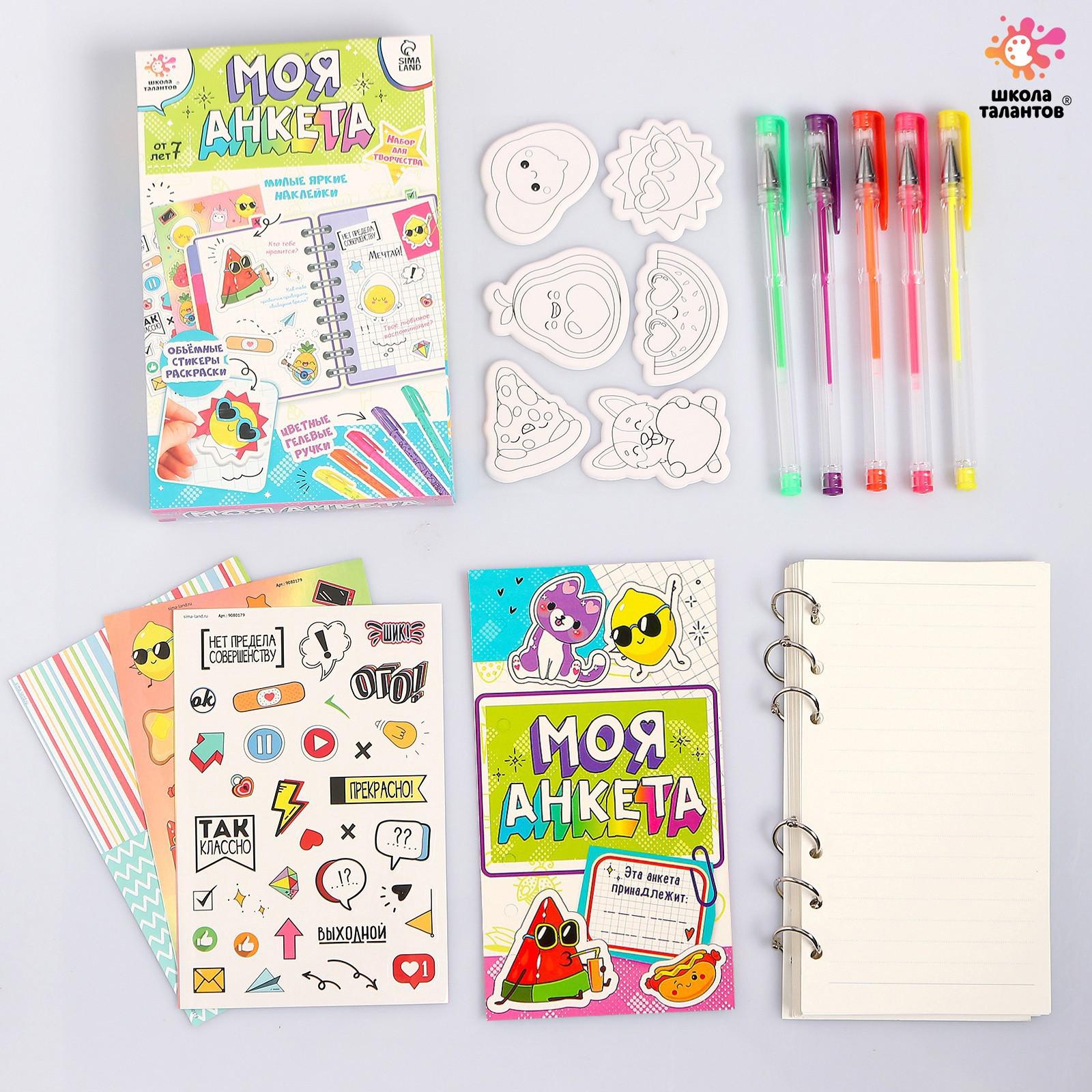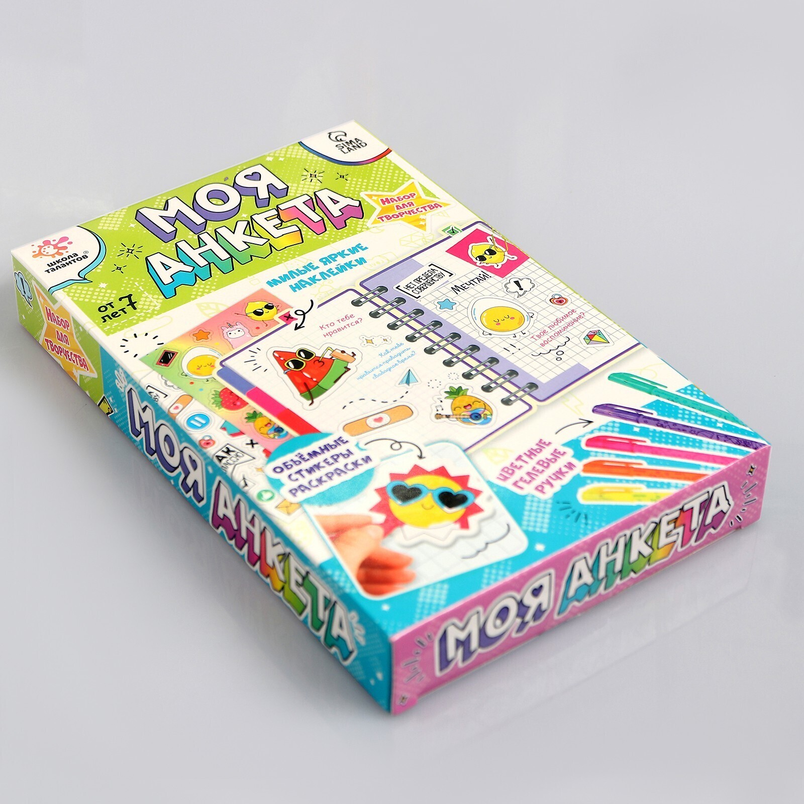 С таким набором девочка сможет оформить уникальную анкету, которую будет давать на заполнение своим друзьям. Скорее берите цветные ручки и начинайте разрисовывать титульную страничку и украшайте наклейками! Будет весело!