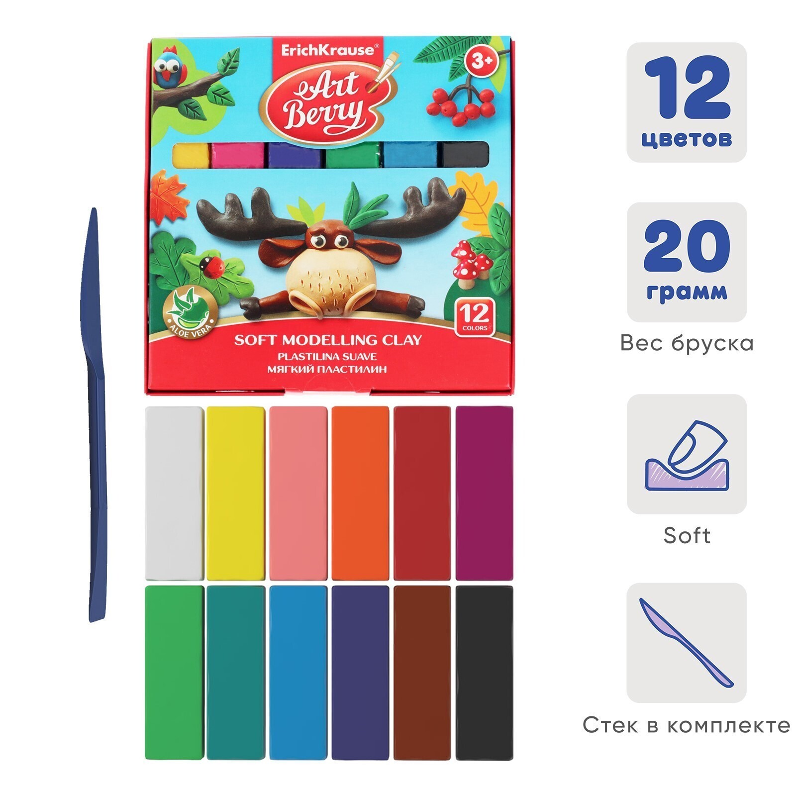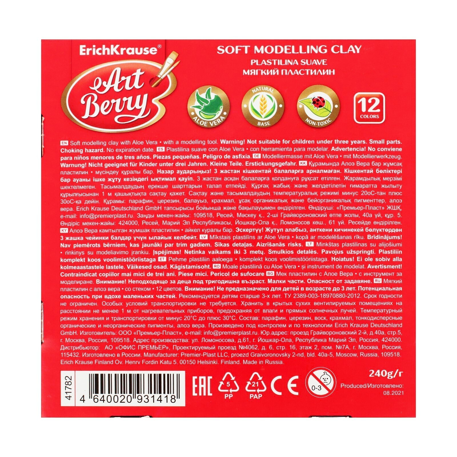 Пластилин мягкий (восковой), 12 цветов, 240 г, ErichKrause ArtBerry премиум, с Алоэ Вера, со стеком, картон, с европодвесом