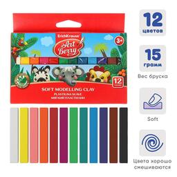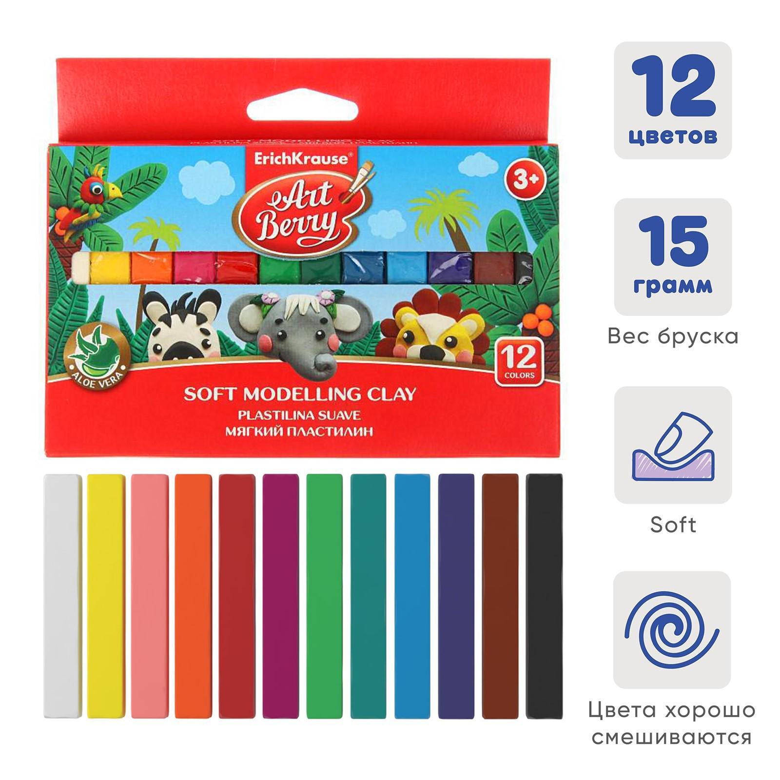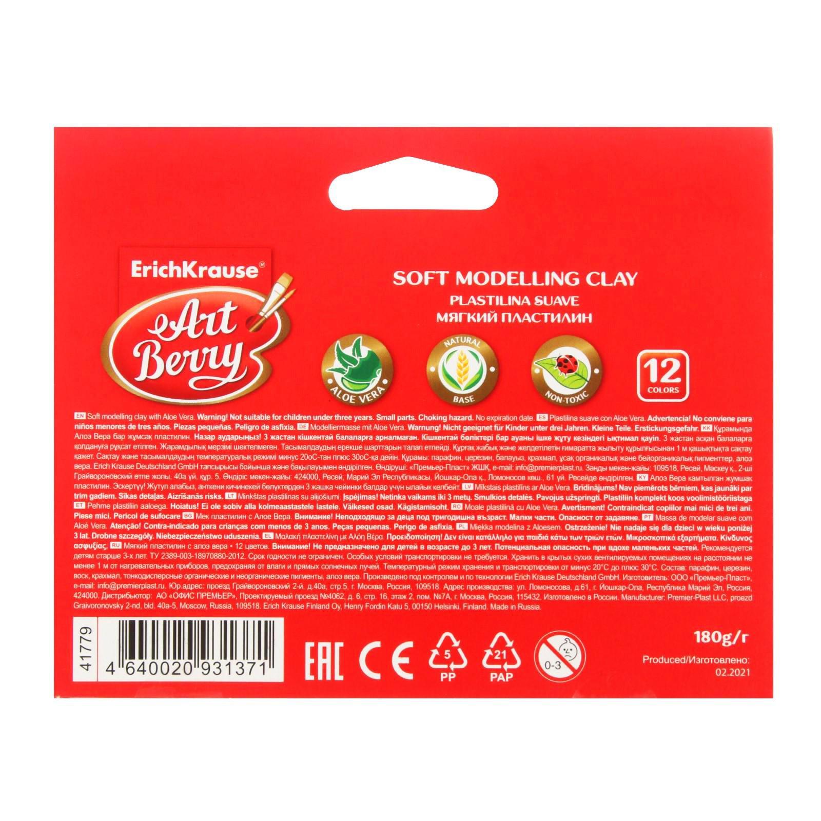 Пластилин мягкий (восковой), 12 цветов, 180 г, ErichKrause ArtBerry премиум, с Алоэ Вера, картон, с европодвесом