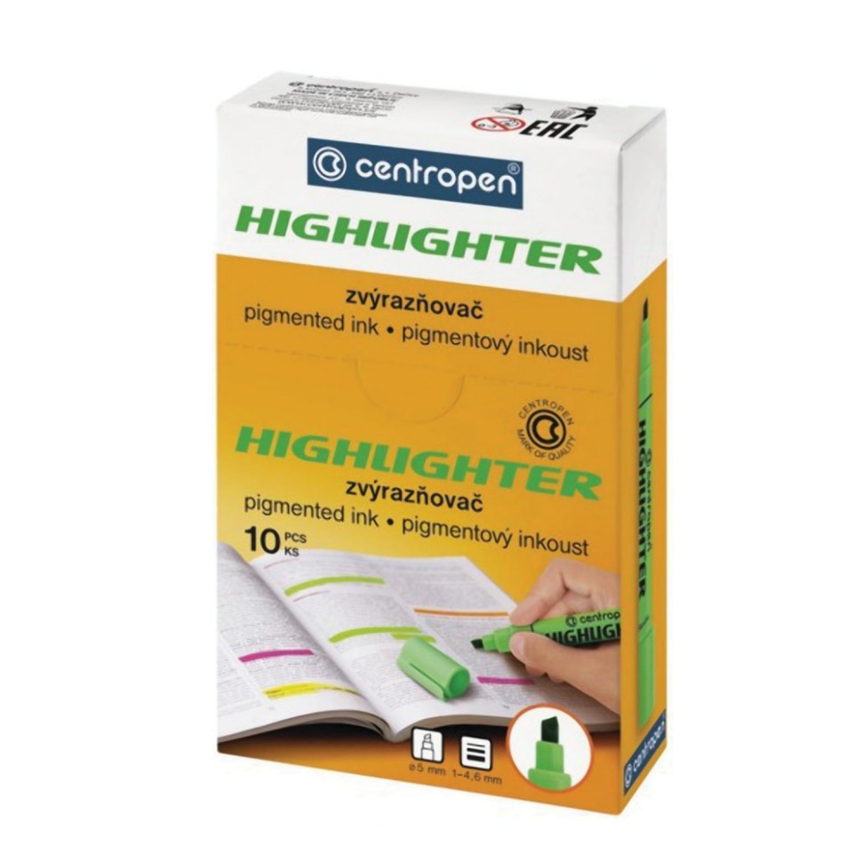 Заводская упаковка нарушена или отсутствует. Товар НОВЫЙ, в полной комплектации. / Высокобъемный текстовыделитель с яркими неоновыми пигментными чернилами и корпусом. Подходит для всех видов бумаги, включая факсовую. Чернила устойчивы к ультрафиолету. Клинообразный пишущий узел. Цвет чернил: желтый. Количество в наборе: 1 шт.. Форма наконечника: скошенный. Спецэффект цвета чернил: неоновый. Основа чернил: спиртовая. Мин. толщина линии письма: 1 мм. Макс. толщина линии письма: 4.6 мм. Повышенная светостойкость: да. Форма корпуса: круглая. Диаметр корпуса: 19 мм. Эргономичная зона захвата: да. Наличие клипа: да. Упаковка: картонная коробка Бренд - CENTROPEN. Производитель - Чехия. Артикул - 8852/1Ж. Штрихкод - 8595013602294