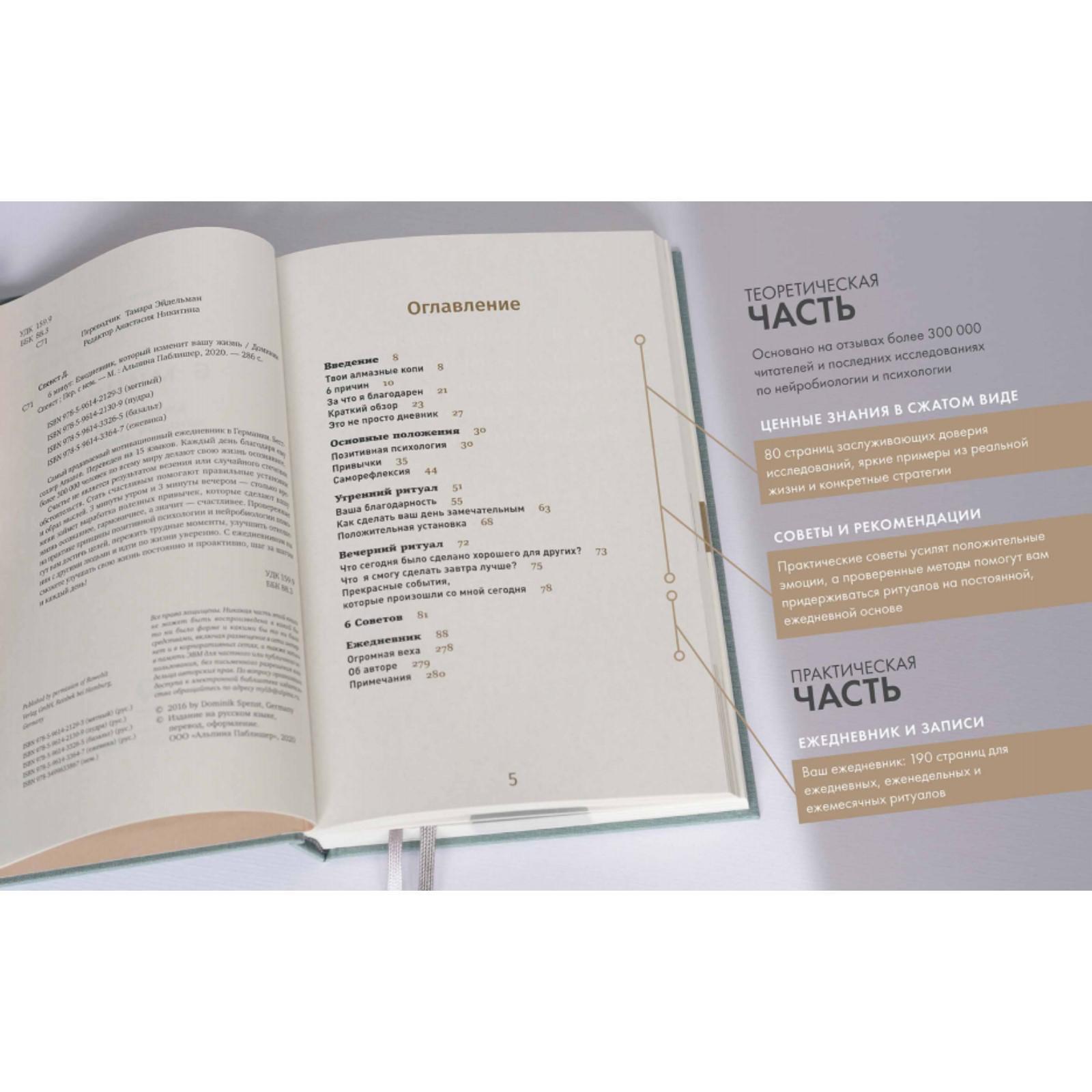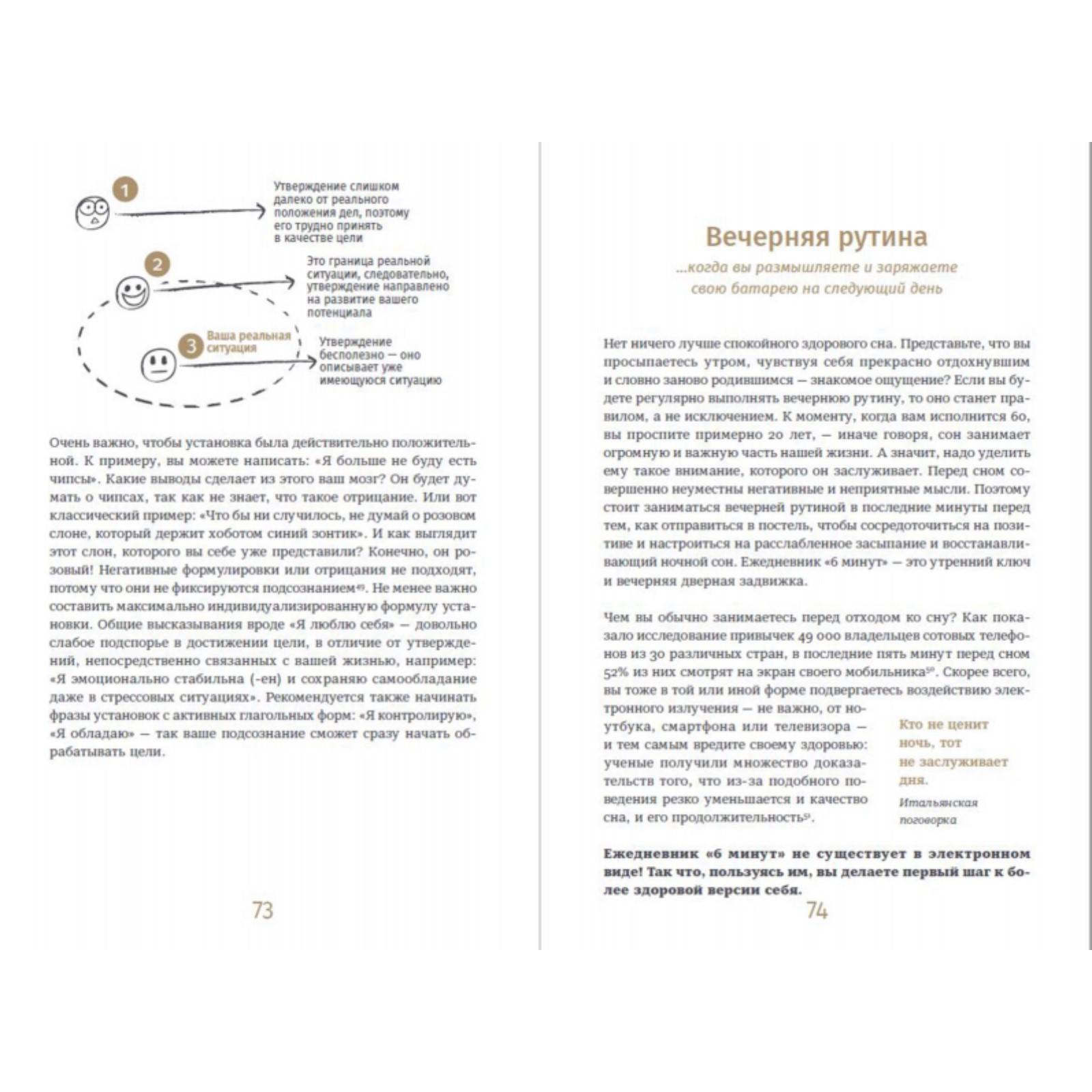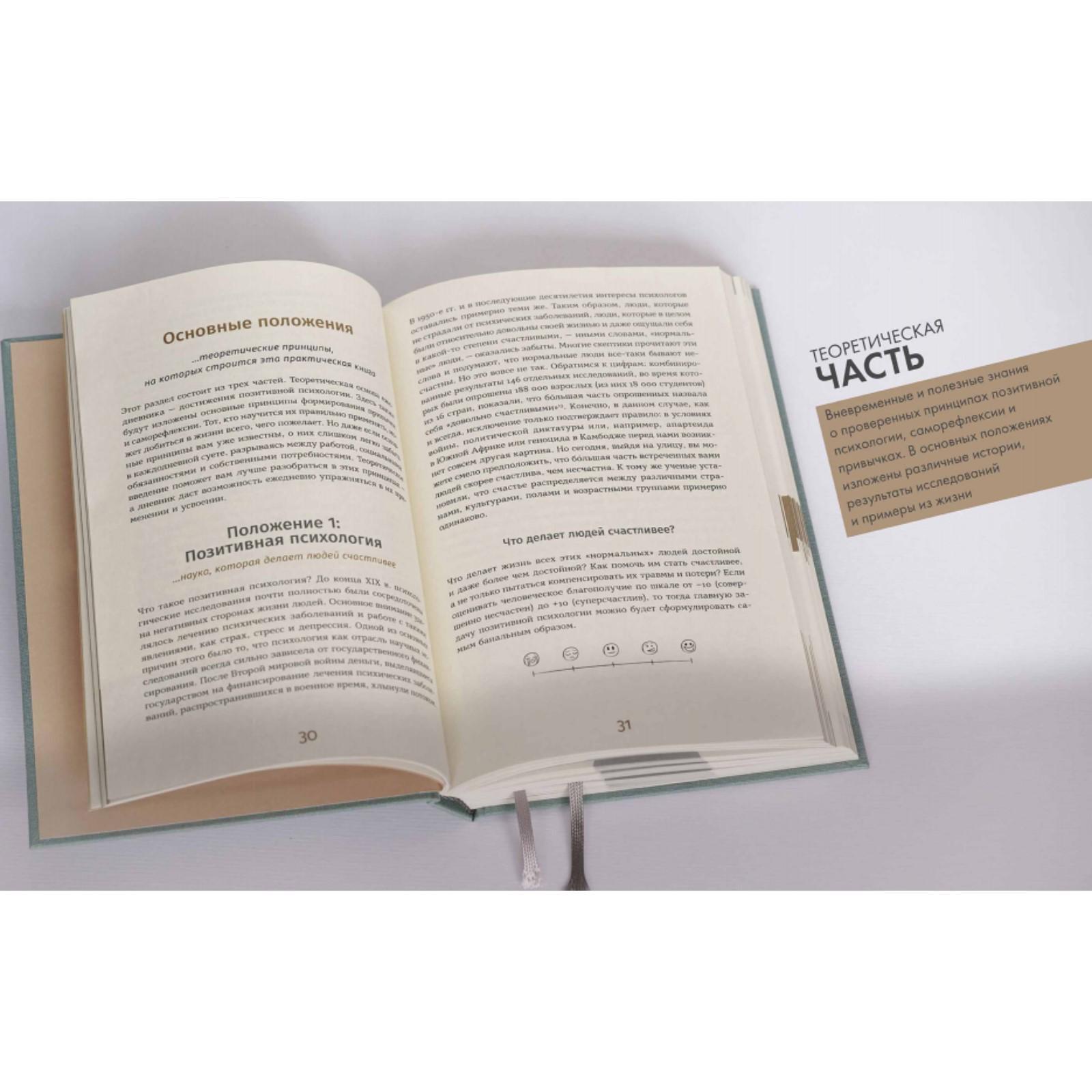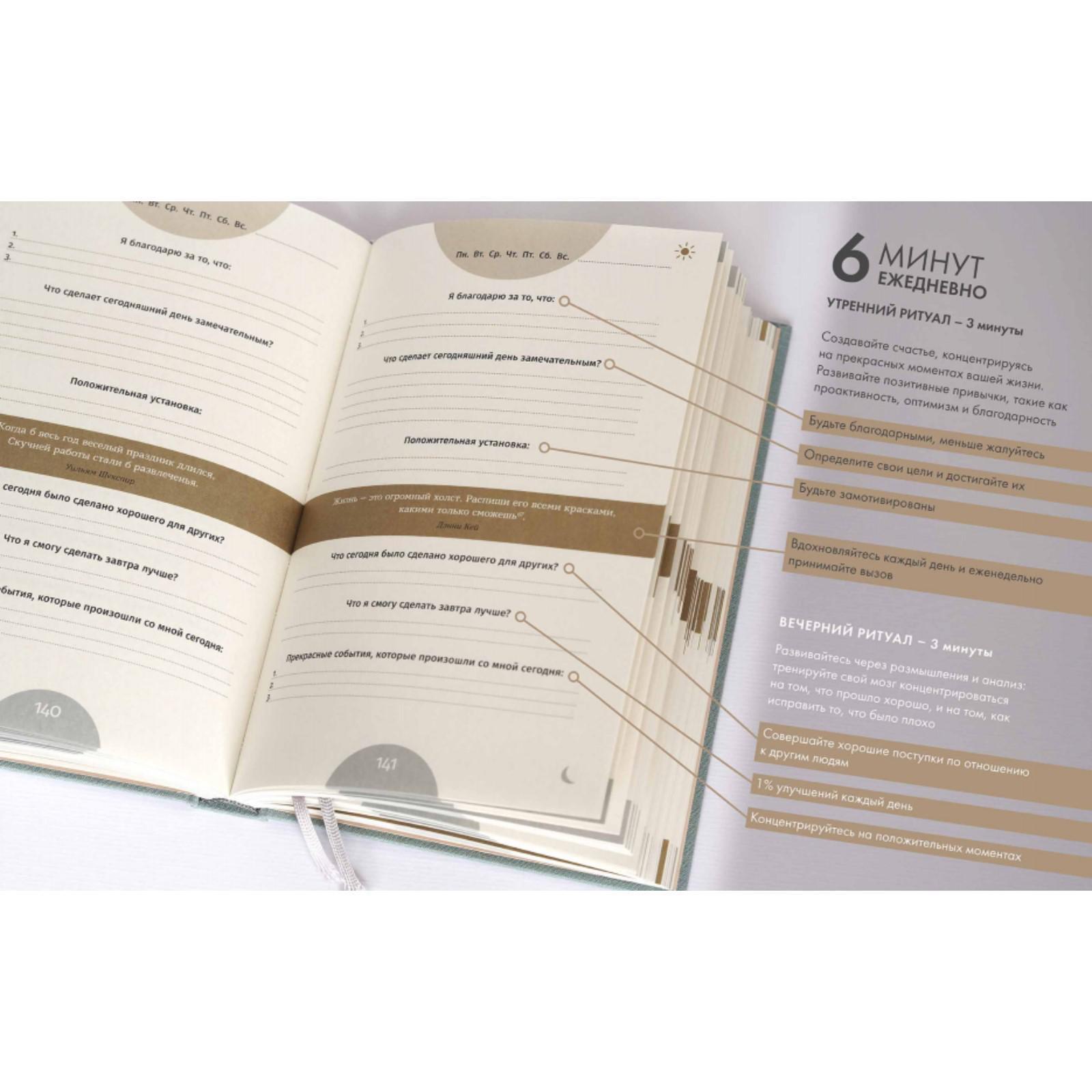 Самый продаваемый мотивационный ежедневник в Германии. Бестселлер Amazon. Переведен на 17 языков. Каждый день благодаря ему более 600 000 человек по всему миру делают свою жизнь осознаннее. Счастье не является результатом везения или случайного стечения обстоятельств. Стать счастливым помогают правильные установки и образ мыслей. 3 минуты утром и 3 минуты вечером - столько времени займет выработка полезных привычек, которые сделают вашу жизнь осознаннее, гармоничнее, а значит - счастливее. Проверенные на практике принципы позитивной психологии и нейробиологии помогут достичь целей, пережить трудные моменты, улучшить отношения с другими людьми и идти по жизни уверенно. С ежедневником вы сможете улучшать свою жизнь постоянно и проактивно, шаг за шагом и каждый день. Сделано с заботой об экологии: печатается на FSC-сертифицированной бумаге. Это значит, что природе наносится минимальный ущерб, сохраняются особо ценные участки леса и места обитания редких животных и растений.