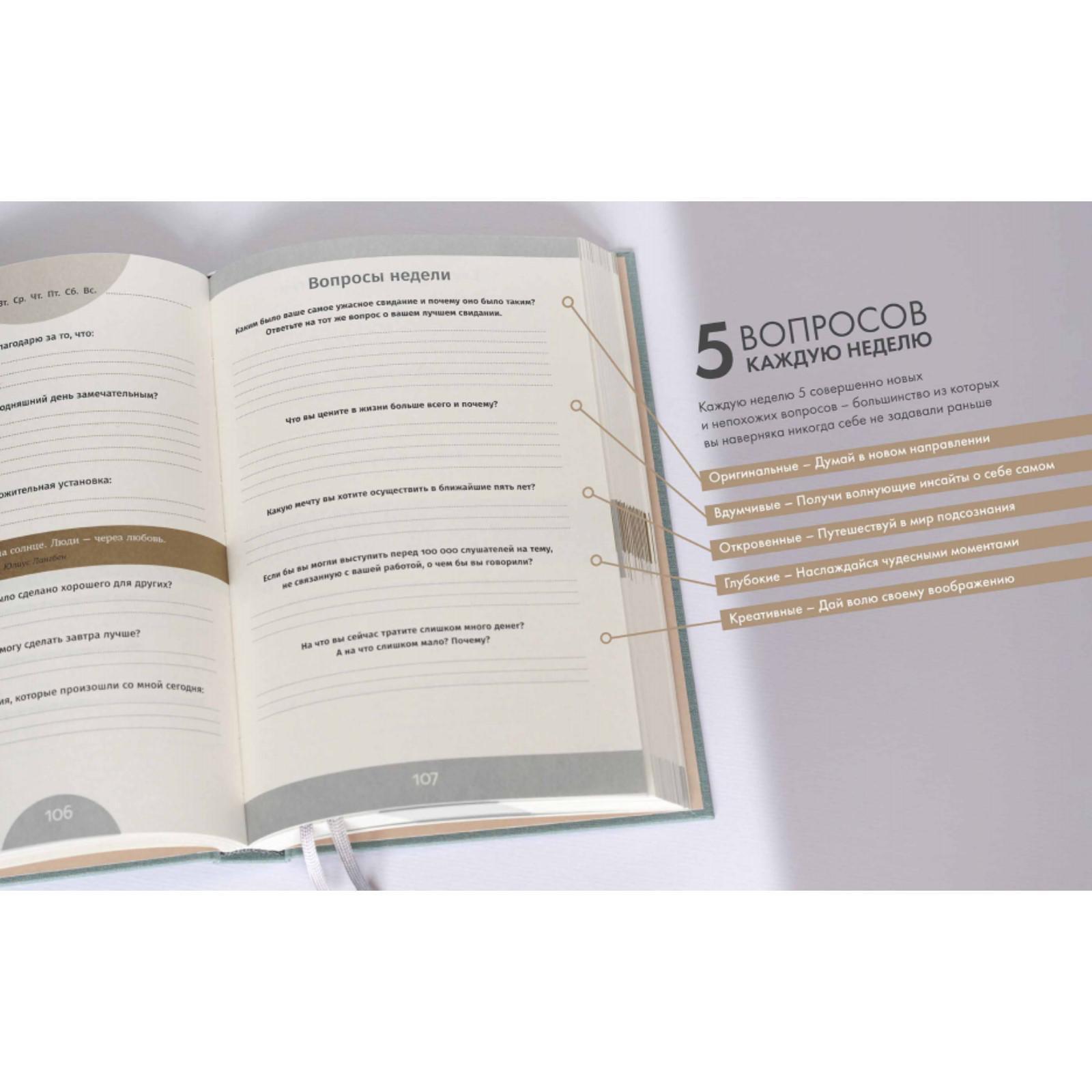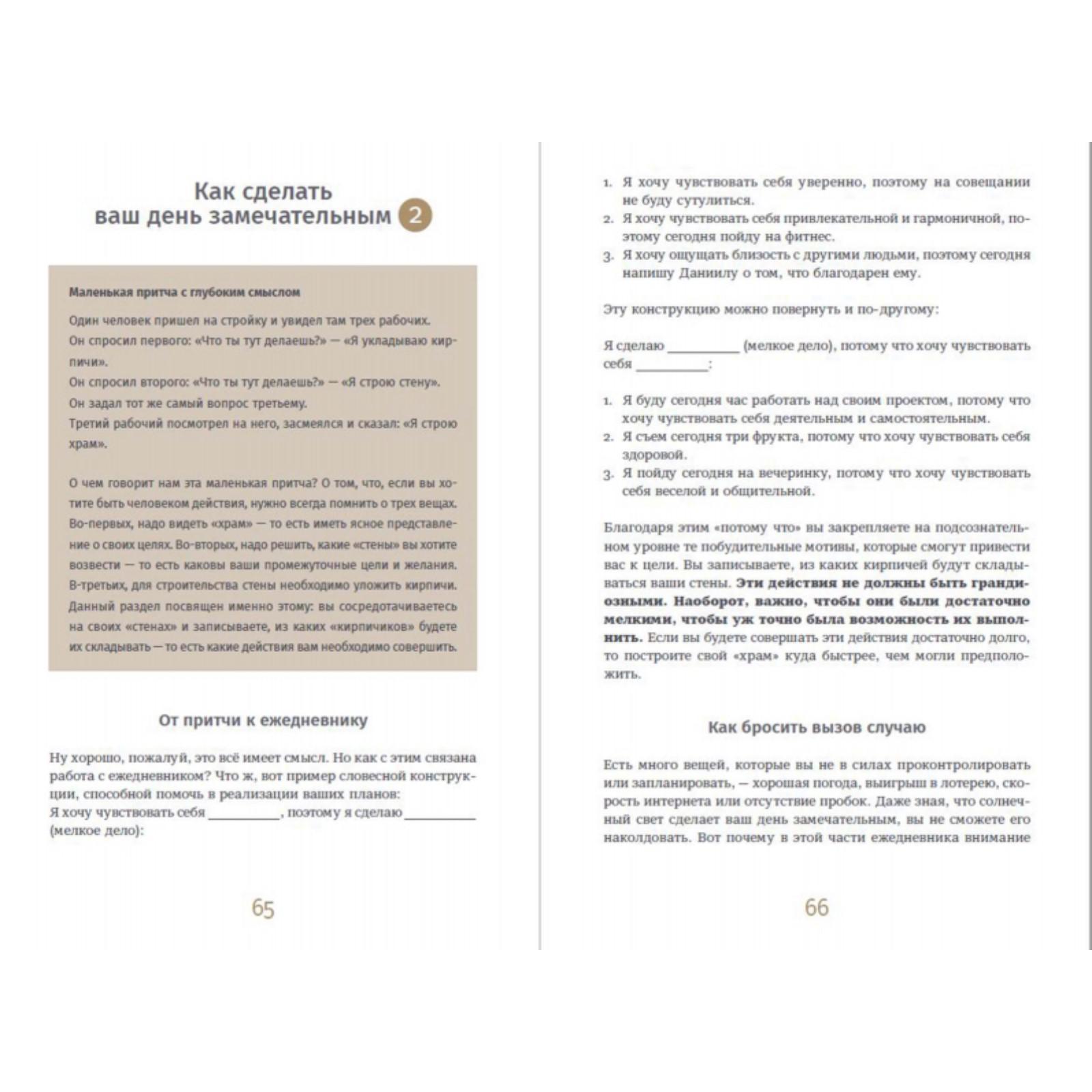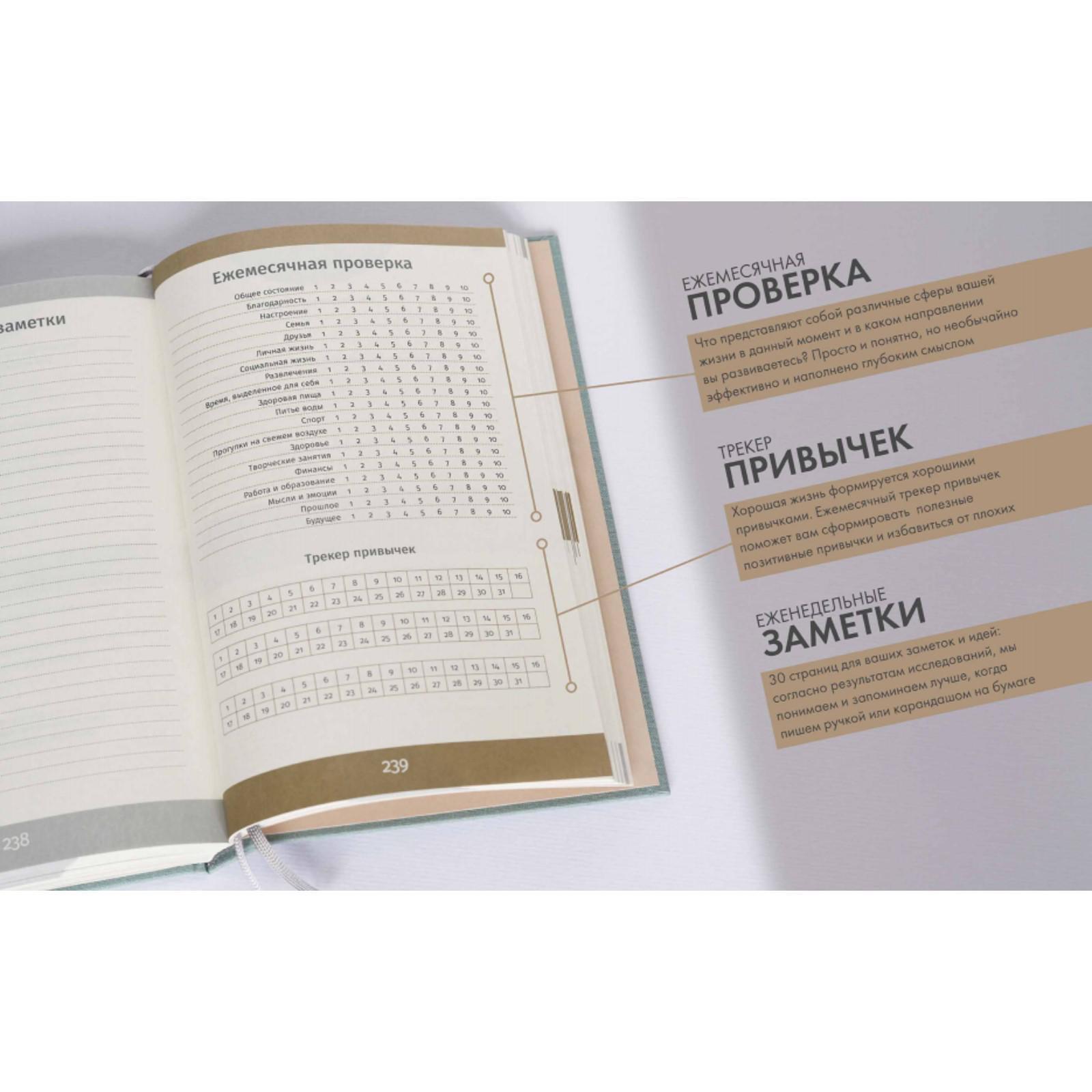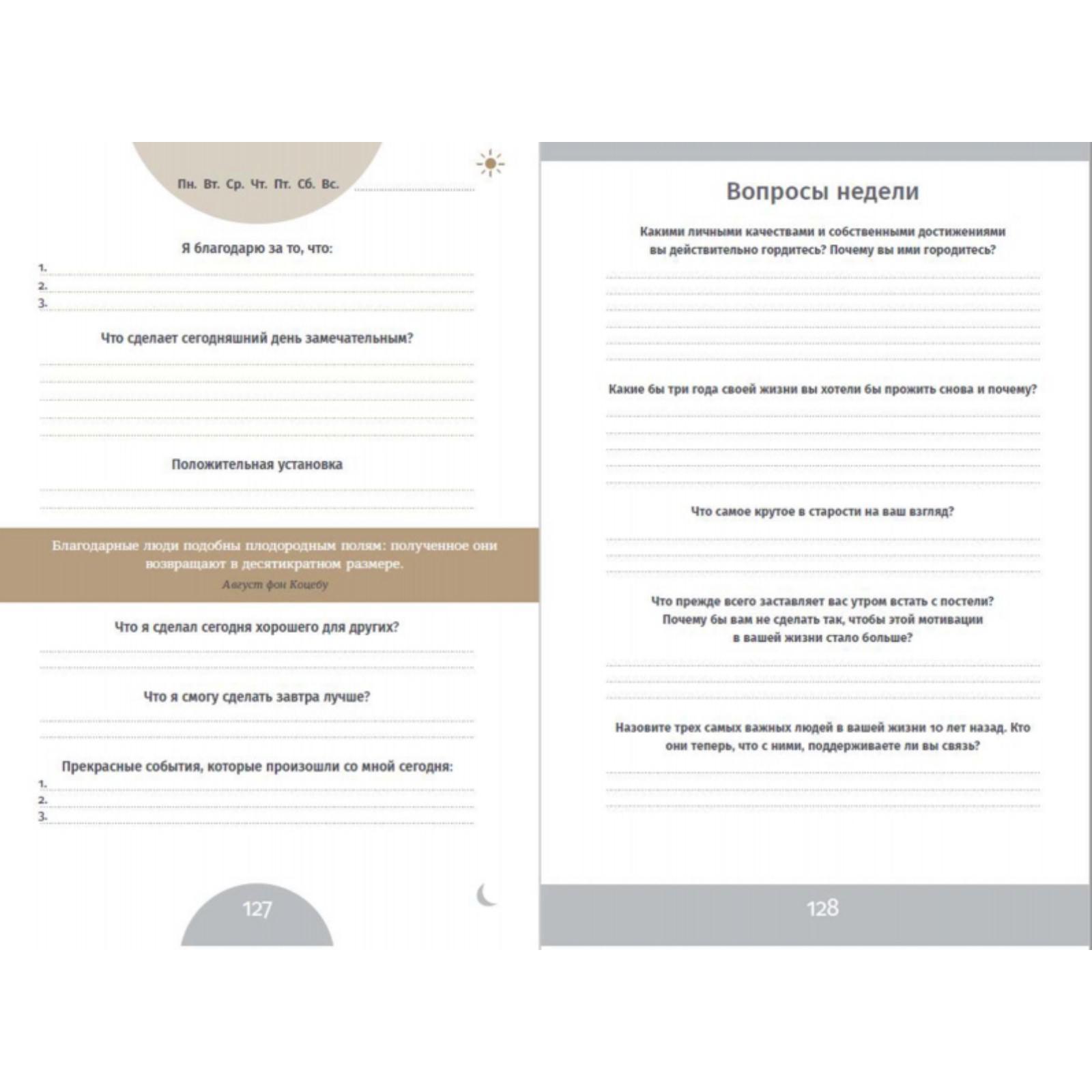 Самый продаваемый мотивационный ежедневник в Германии. Бестселлер Amazon. Переведен на 17 языков. Каждый день благодаря ему более 600 000 человек по всему миру делают свою жизнь осознаннее. Счастье не является результатом везения или случайного стечения обстоятельств. Стать счастливым помогают правильные установки и образ мыслей. 3 минуты утром и 3 минуты вечером - столько времени займет выработка полезных привычек, которые сделают вашу жизнь осознаннее, гармоничнее, а значит - счастливее. Проверенные на практике принципы позитивной психологии и нейробиологии помогут достичь целей, пережить трудные моменты, улучшить отношения с другими людьми и идти по жизни уверенно. С ежедневником вы сможете улучшать свою жизнь постоянно и проактивно, шаг за шагом и каждый день. Сделано с заботой об экологии: печатается на FSC-сертифицированной бумаге. Это значит, что природе наносится минимальный ущерб, сохраняются особо ценные участки леса и места обитания редких животных и растений.