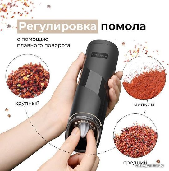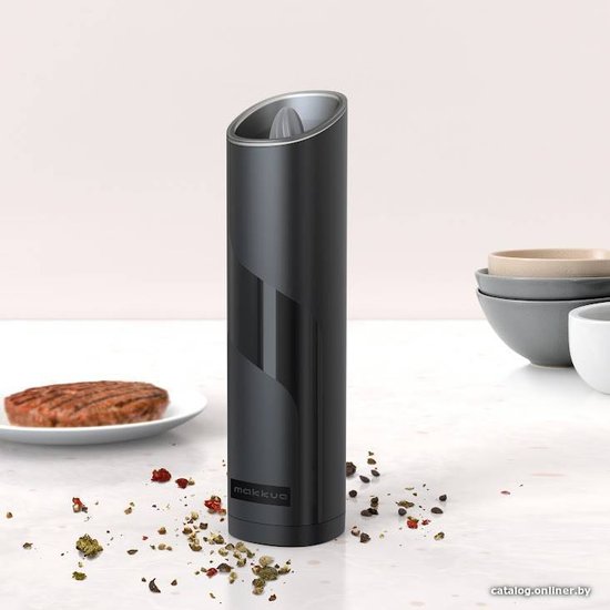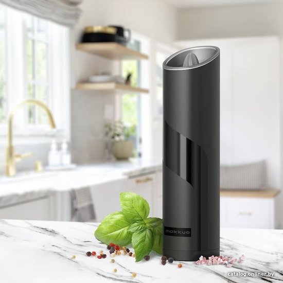 Электромельница Makkua Spices series GBG-01 - устройство с гравитационным механизмом, благодаря которому для получения свежемолотой приправы или соли достаточно просто перевернуть его вверх дном. Механизм мельницы расположен в верхней части корпуса, что позволяет избежать попадания остатков помола на поверхность стола после использования. Корпус изготовлен из гладкого и приятного на ощупь материала, на котором не остаются следы от пальцев. Когда электромельница работает, автоматически включается светодиодная подсветка.Электромельница Makkua Spices series GBG-01 - устройство с гравитационным механизмом, благодаря которому для получения свежемолотой приправы или соли достаточно просто перевернуть его вверх дном. Механизм мельницы расположен в верхней части корпуса, что позволяет избежать попадания остатков помола на поверхность стола после использования. Корпус изготовлен из гладкого и приятного на ощупь материала, на котором не остаются следы от пальцев. Когда электромельница работает, автоматически включается светодиодная подсветка.