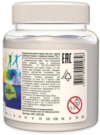 Гуашь художественная 1 шт. ЛУЧ "Классика", 240 мл, белила цинковые, 30С 1816-08