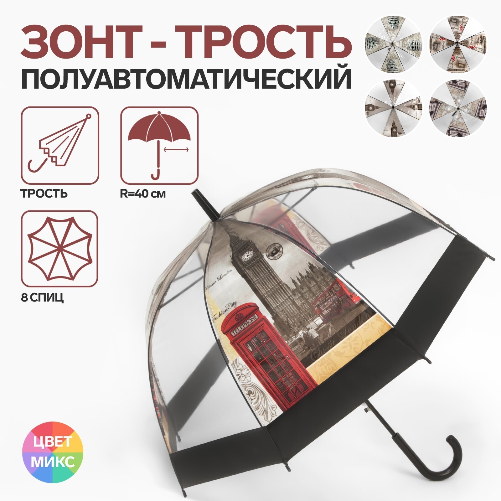 Зонт - трость полуавтоматический «Города», 8 спиц, R = 40 см, рисунок МИКС