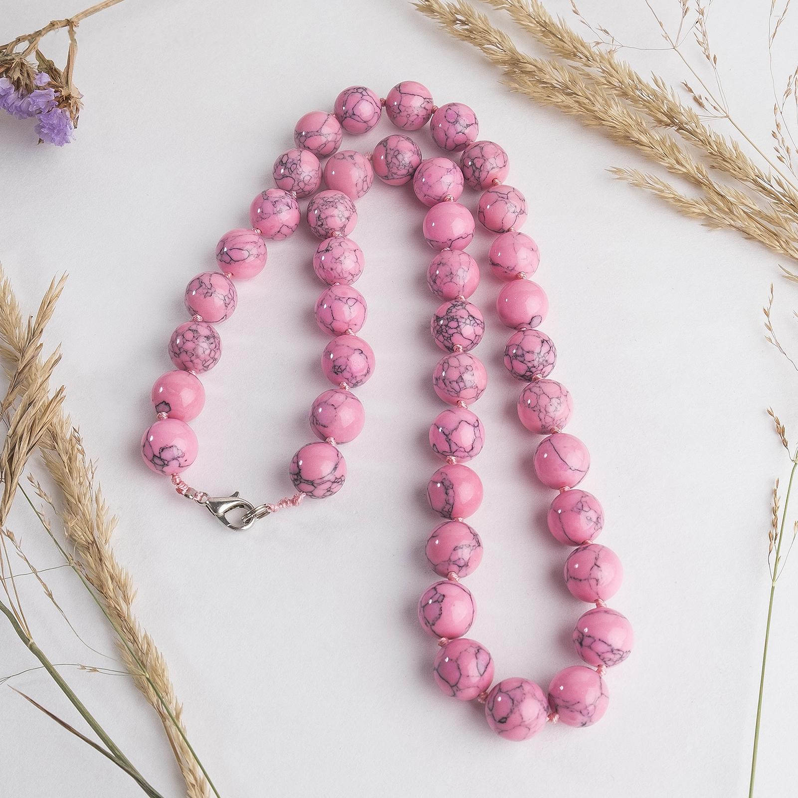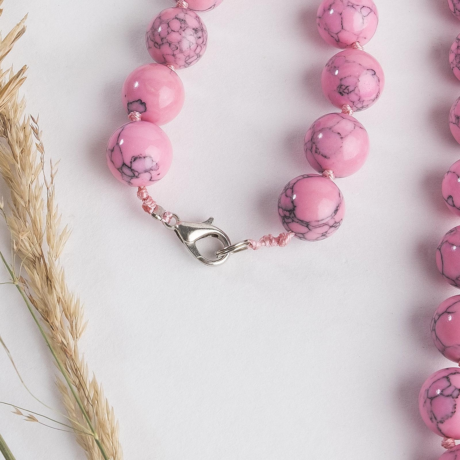Круглые гладкие бусины сделаны из родонита. Оттенок может немного отличаться от представленного на фотографии в зависимости от настроек экрана. Бусины могут различаться по форме и размеру. Возможны неровности естественного происхождения.