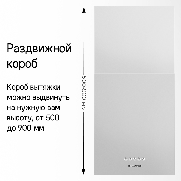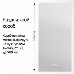 В зависимости от высоты потолка кухни, вы можете использовать основной корпус или прикрепить дополнительный кожух и получить вытяжку высотой 90 см.