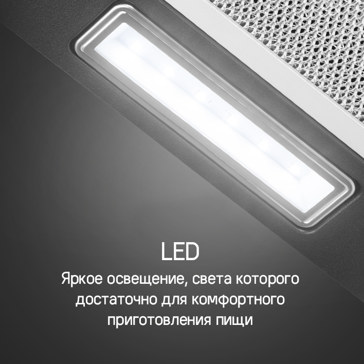 Современное яркое LED освещение из лампы мощностью 1,5 Вт, будет превосходно освещать рабочую зону приготовления.