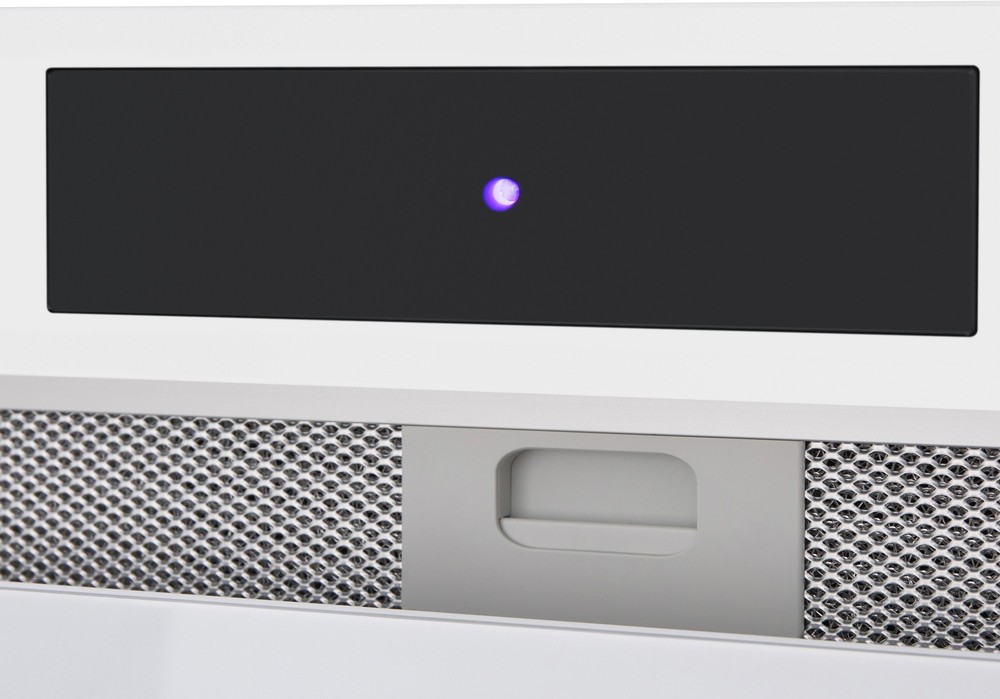 Отличительная особенность этой модели – это бесконтактное управление работой вытяжки. Простым взмахом руки вы изменяете скорость работы вентилятора и регулируете освещение. Каждому из 4-х режимов работы соответствует свой цвет индикатора на дисплее.
