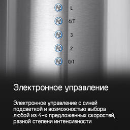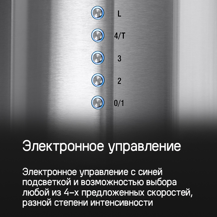 Вытяжка оснащена электронным управлением с возможностью выбора любой из 4-х предложенных скоростей, разной степени интенсивности.