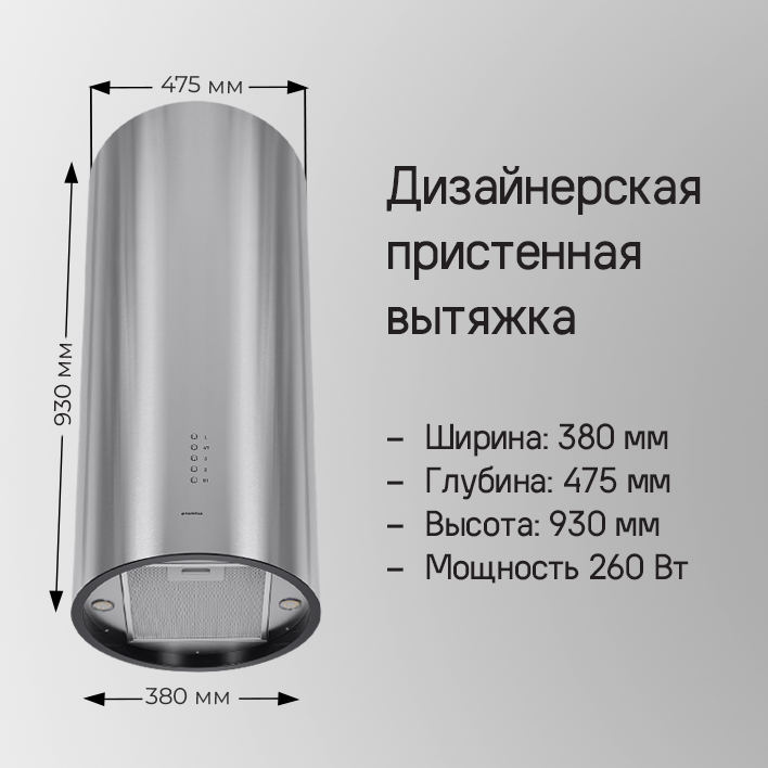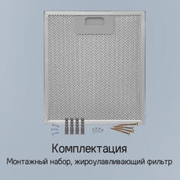 Полная потребляемая мощность составляет 260 Вт, а максимальная производительность 1000 м3/ч, что позволяет работать на кухнях большой площади и эффективно очищать воздух.