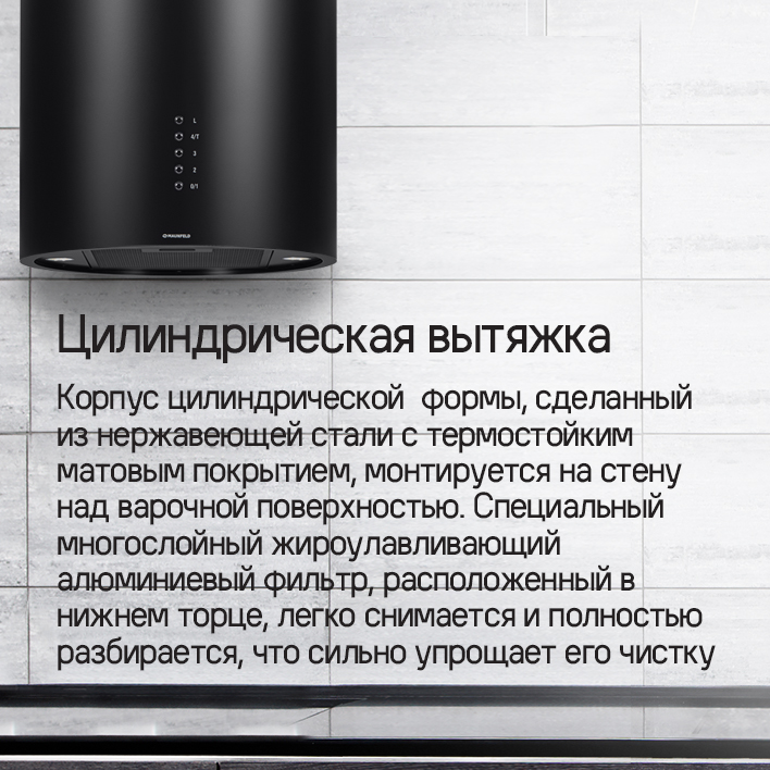 Дизайнеры компании Maunfeld постоянно работают над созданием новых моделей, продумывая каждую мелочь в исполнении кухонных вытяжек. Дизайнерская кухонная вытяжка выполнена. Современная и мощная она способна украсить любой кухонный дизайн проект.