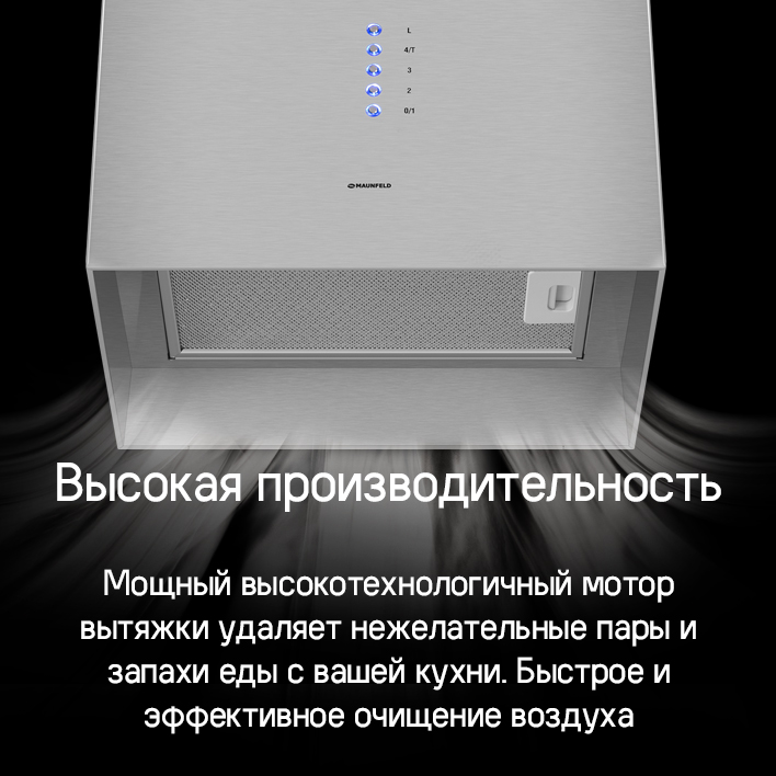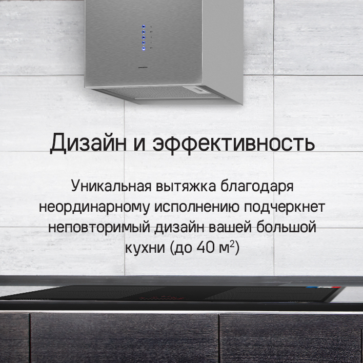 Высокая производительность 1150 м3 /ч обеспечит чистый воздух во время готовки и после нее.