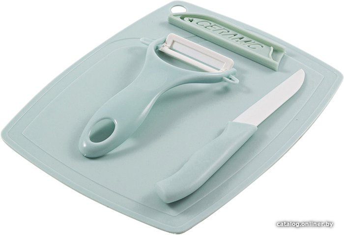 - Комплектация - нож с керамическим лезвием в ножнах (17*2 см, длина лезвия 9 см)- овощечистка с керамическим лезвием (12,2*7,5 см)- доска разделочная (размер: 20*16 см)