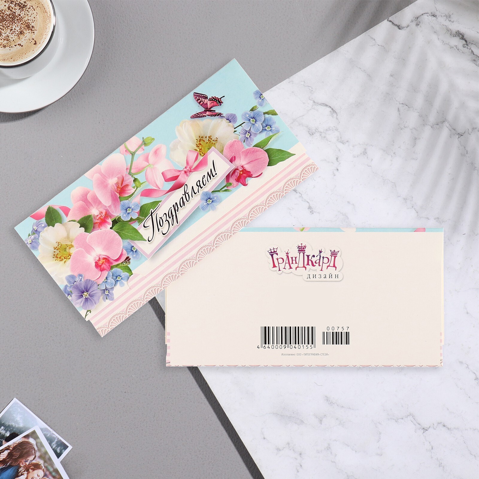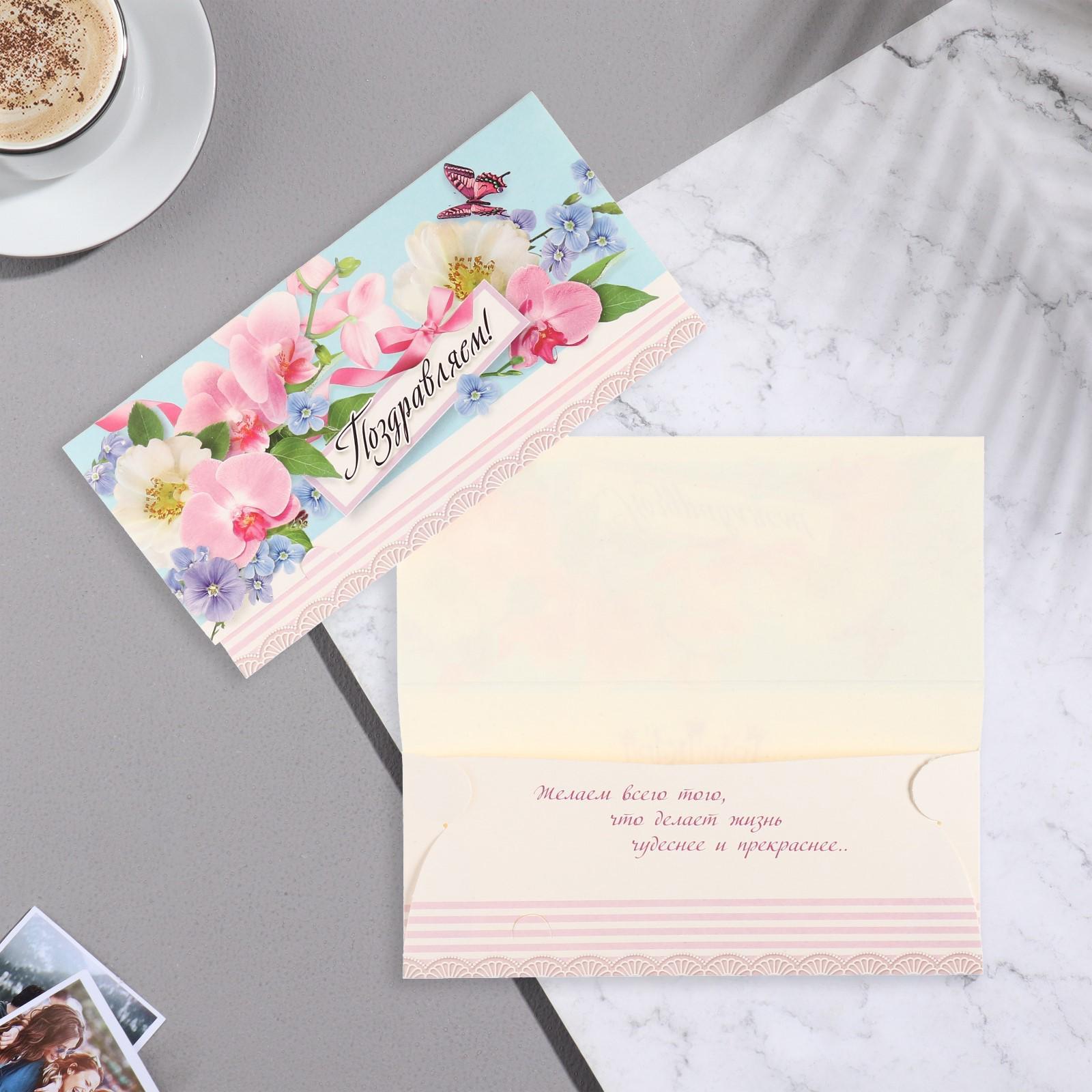 Конверт для денег "Поздравляем!" розовые цветы, голубой фон, 8,3х16,3 см