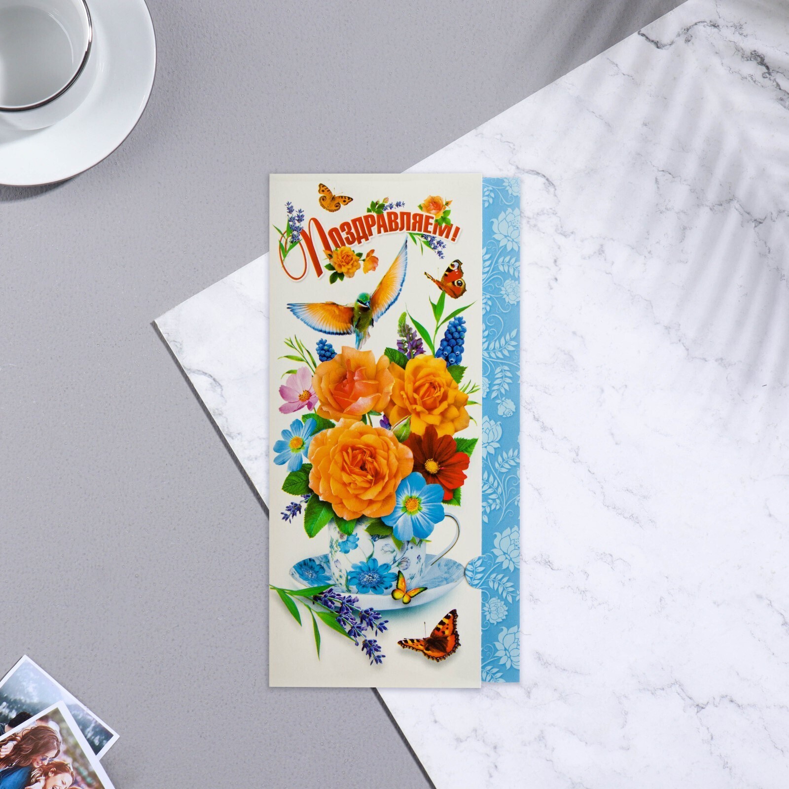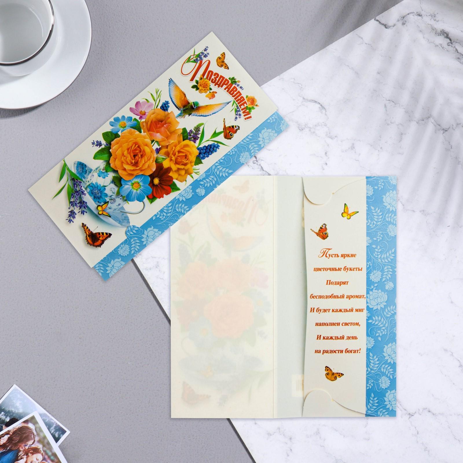 Конверт для денег "Поздравляем!" цветы в вазе, глиттер, 16х8см