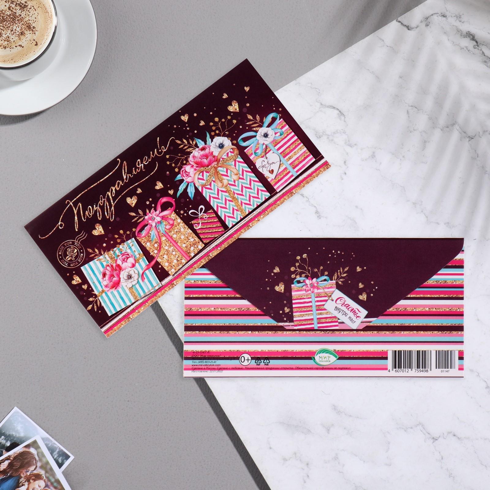 Конверт для денег "Поздравляем!" подарки, полосы, 16,5х8,5 см