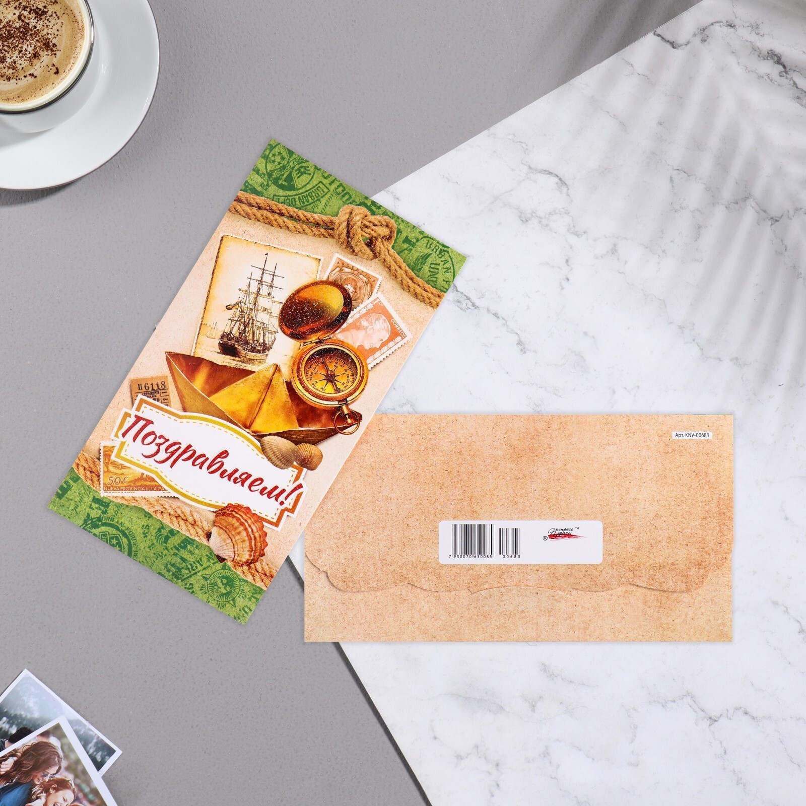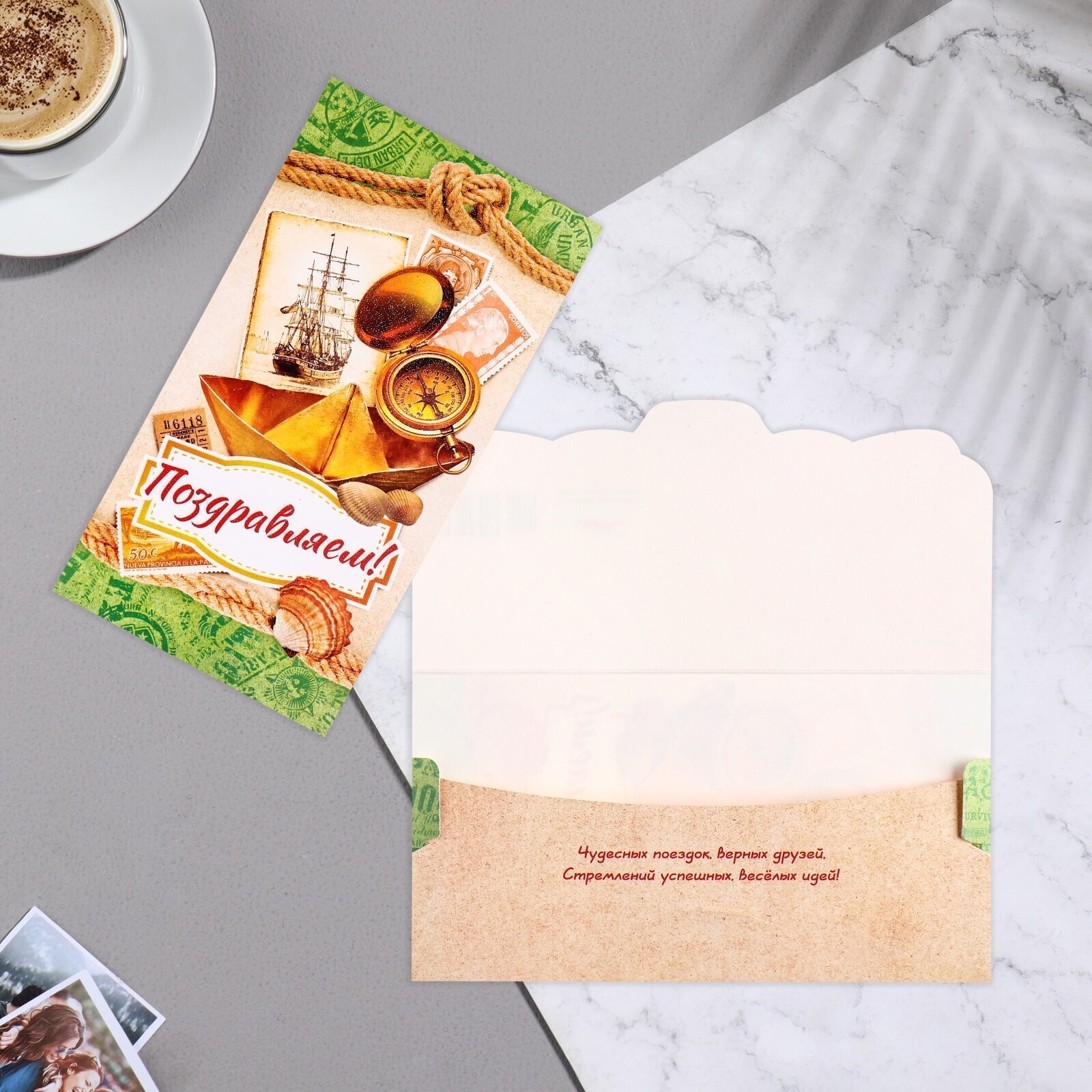 Конверт для денег "Поздравляем!" корабль, компас, ракушки, 18,5х8,5 см